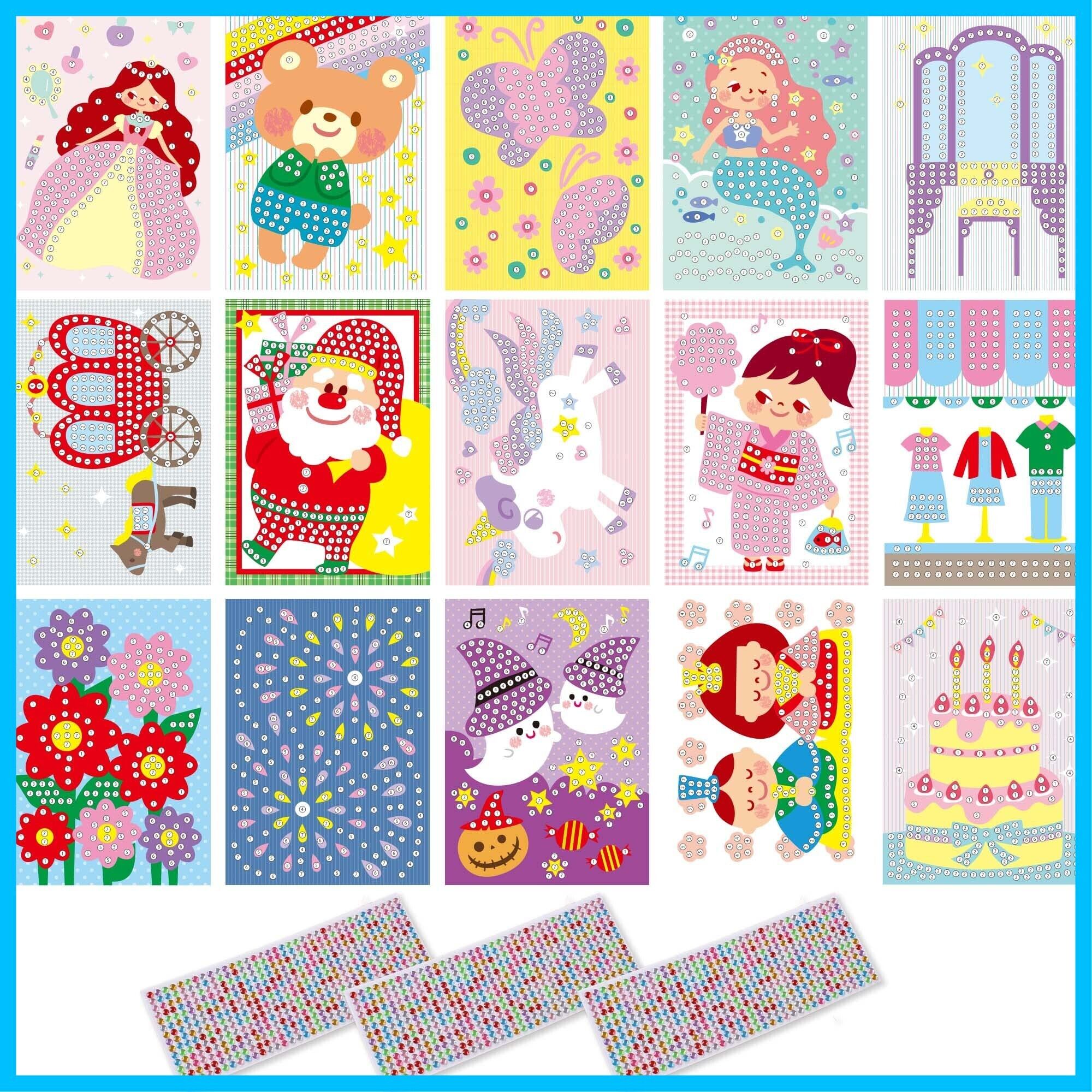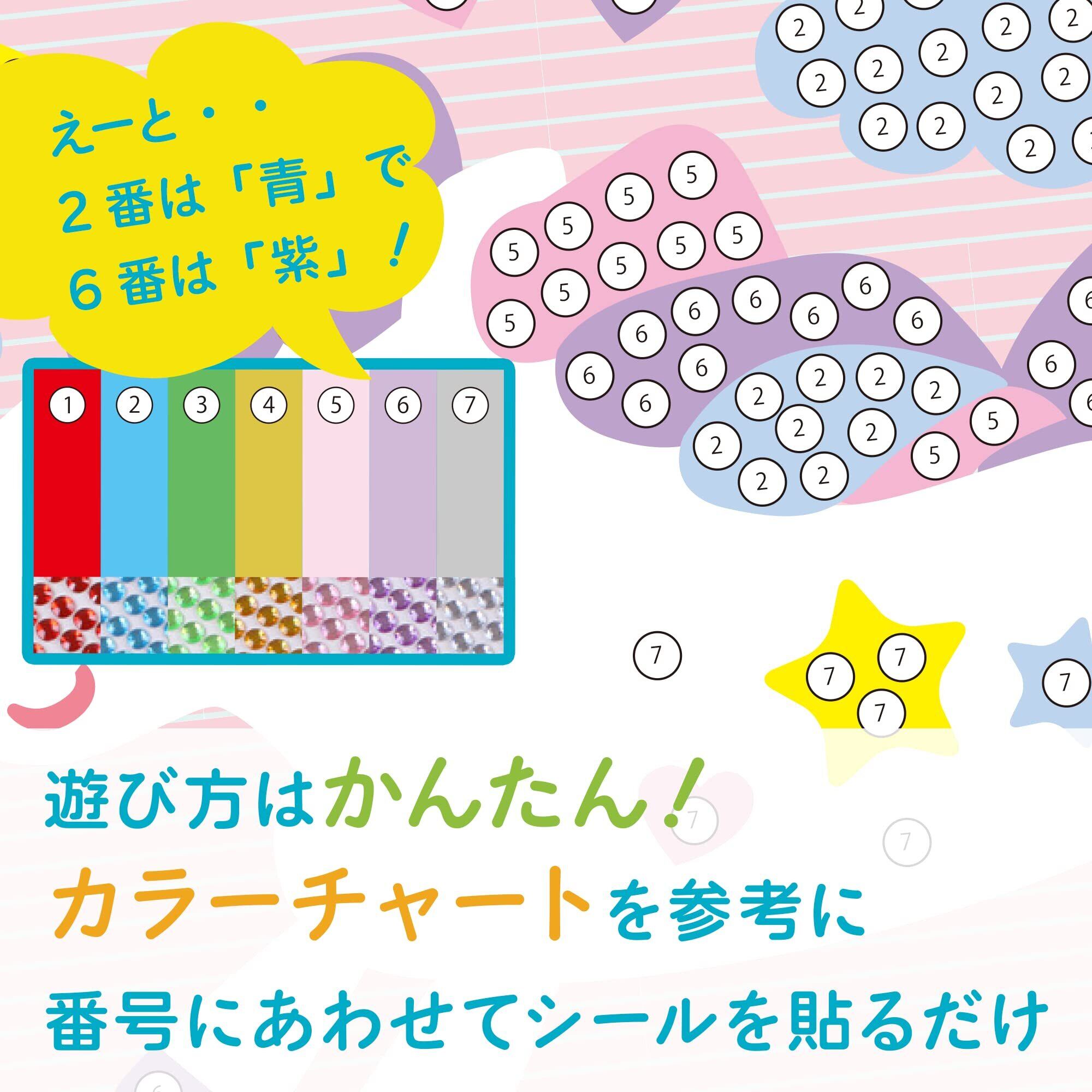 【商品詳細】 主な素材:紙 シール台紙サイズ:182mm×257mm(B5) セット内容:塗り絵付きシール台紙×15、カラーチャート15枚、クリスタルシール(約180pcs×シール台紙15枚分)、予備用クリスタルシール×3枚 デザイン数:15種類 推奨年齢:5歳以上