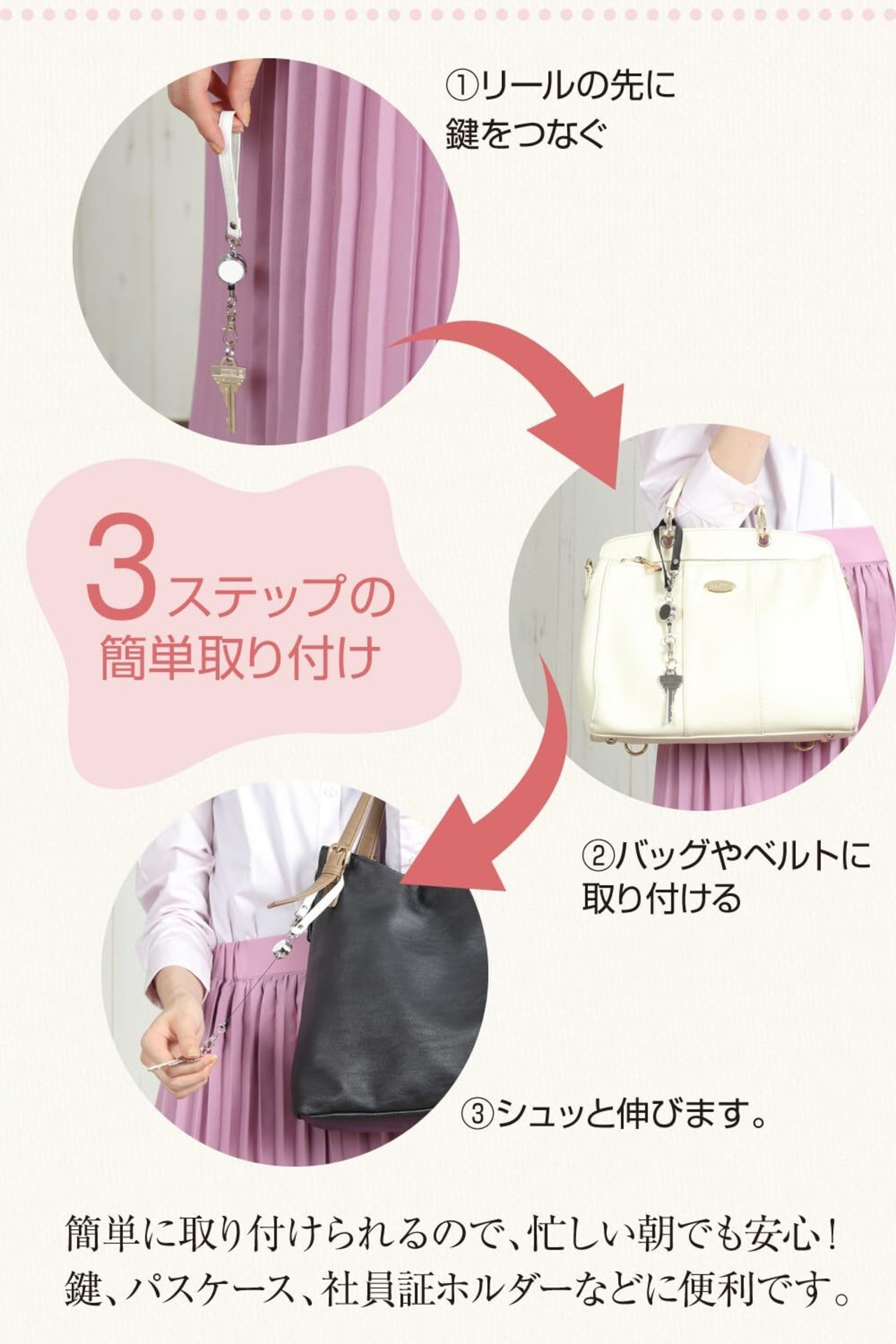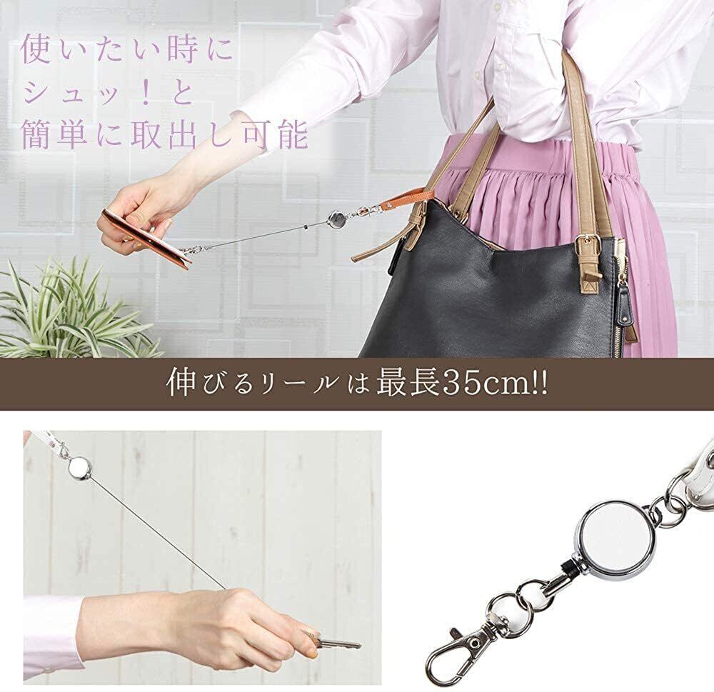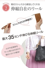 【伸びるリール付き】最長 35cm まで伸縮自在のリールが付いたキーホルダー。ご自宅の鍵、パスケース、コインケース、小物入れ、証明書入れ、学生証入れ、ICカード入れ、社員証 (IDカード) ケース等をバッグやベルトに付けておけば、あちこち探す手間をとられず、ご使用の際はスムーズに取り出しが可能です。