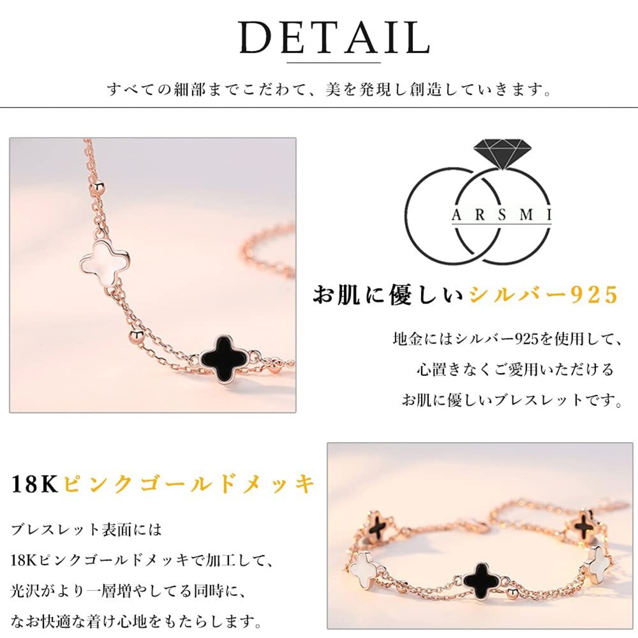 【品質保証】国際標準シルバー925を採用して、四つ葉ブレスレットが金属アレルギー対応になります。18Kピンクゴールドメッキで、ブレスレットの色が長く保たせて、普通のメッキより長く輝いています。金属アレルギーの原因物質は一切含まず、お肌に優しくてアレルギー反応の心配はございません。安心して末永くご愛用いたたけます。