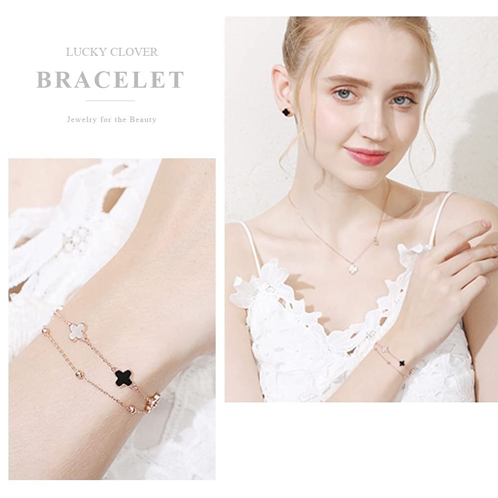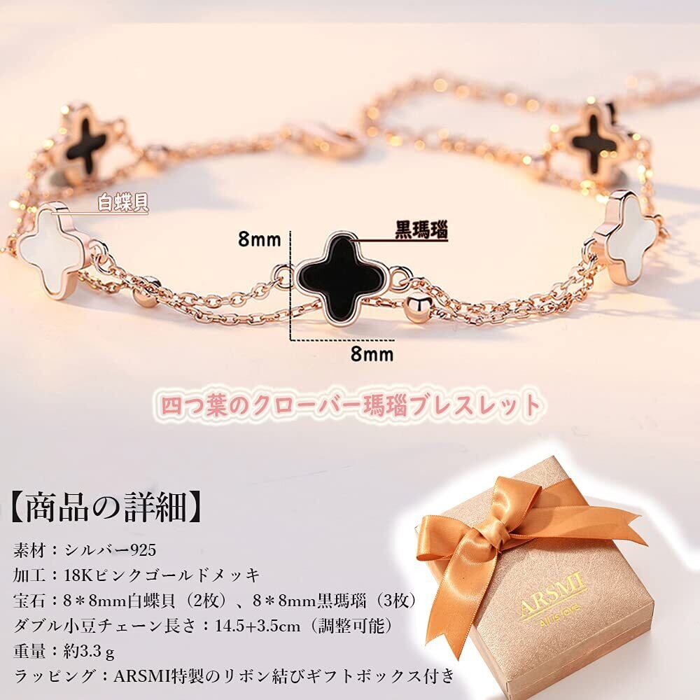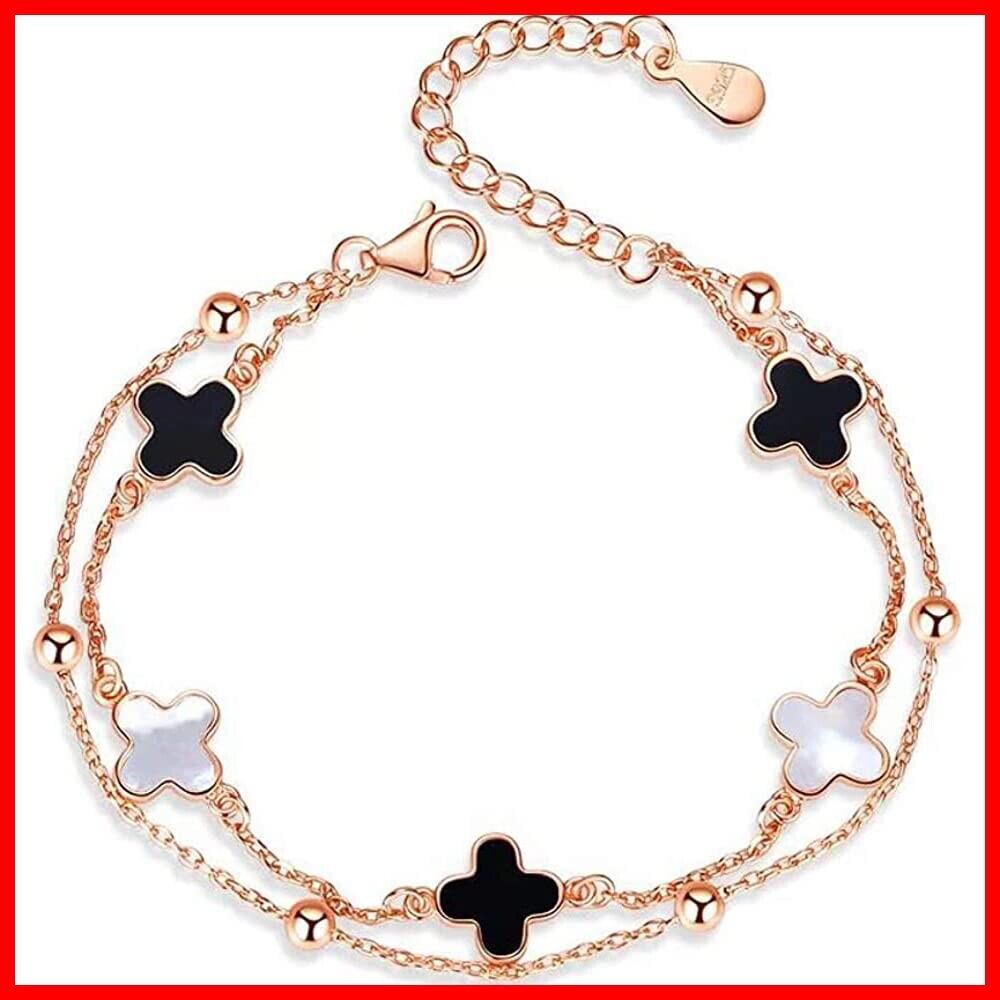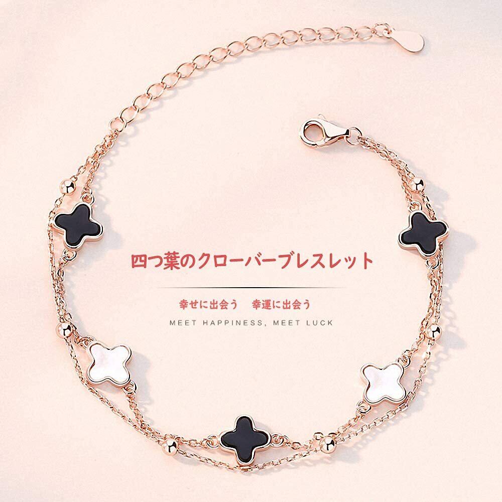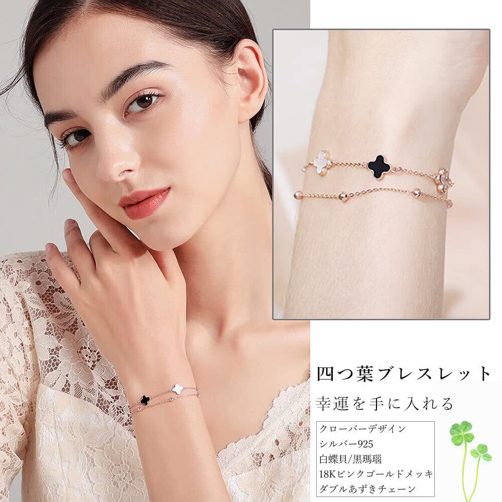ブレスレット レディース バングル 四つ葉 シルバー925 18Kピンクゴールドメッキ 金属アレルギー対応 瑪瑙 白蝶贝 ダブルチェーン 幸運ブレスレット 人気 彼女 妻 記念日 誕生日プレゼント 母の日 ギフトボックス付き(ピンクゴールド2)