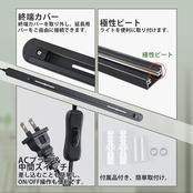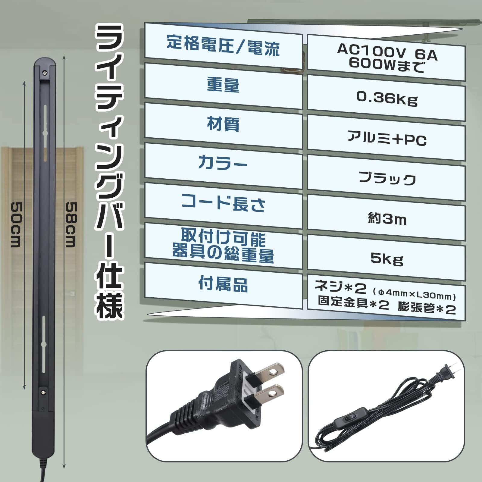 【仕様】全長約0.58m コード長さ:3m 重量:0.36kg 材質:アルミ+PC カラー:黒 (ブラック) 定格電圧/電流:AC100V 6A 600Wまで 取付け可能器具の総重量:5kg以下。