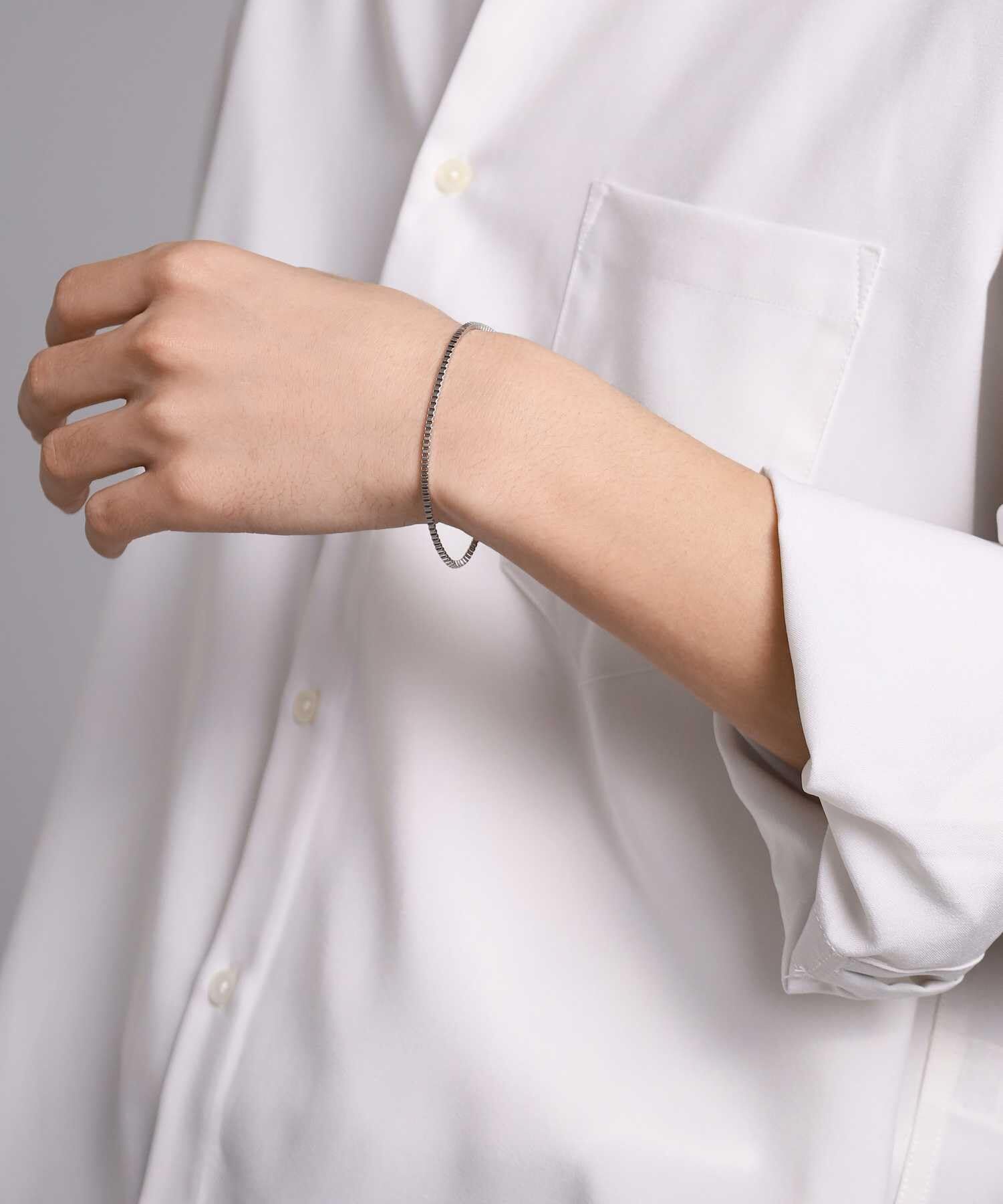 【細身のサイズ感】「手首周り」17cm前後「チェーン全長」19cm「幅」0.2cm「重量」2.0g / 細身であらゆるスタイルに合わせやすいです。