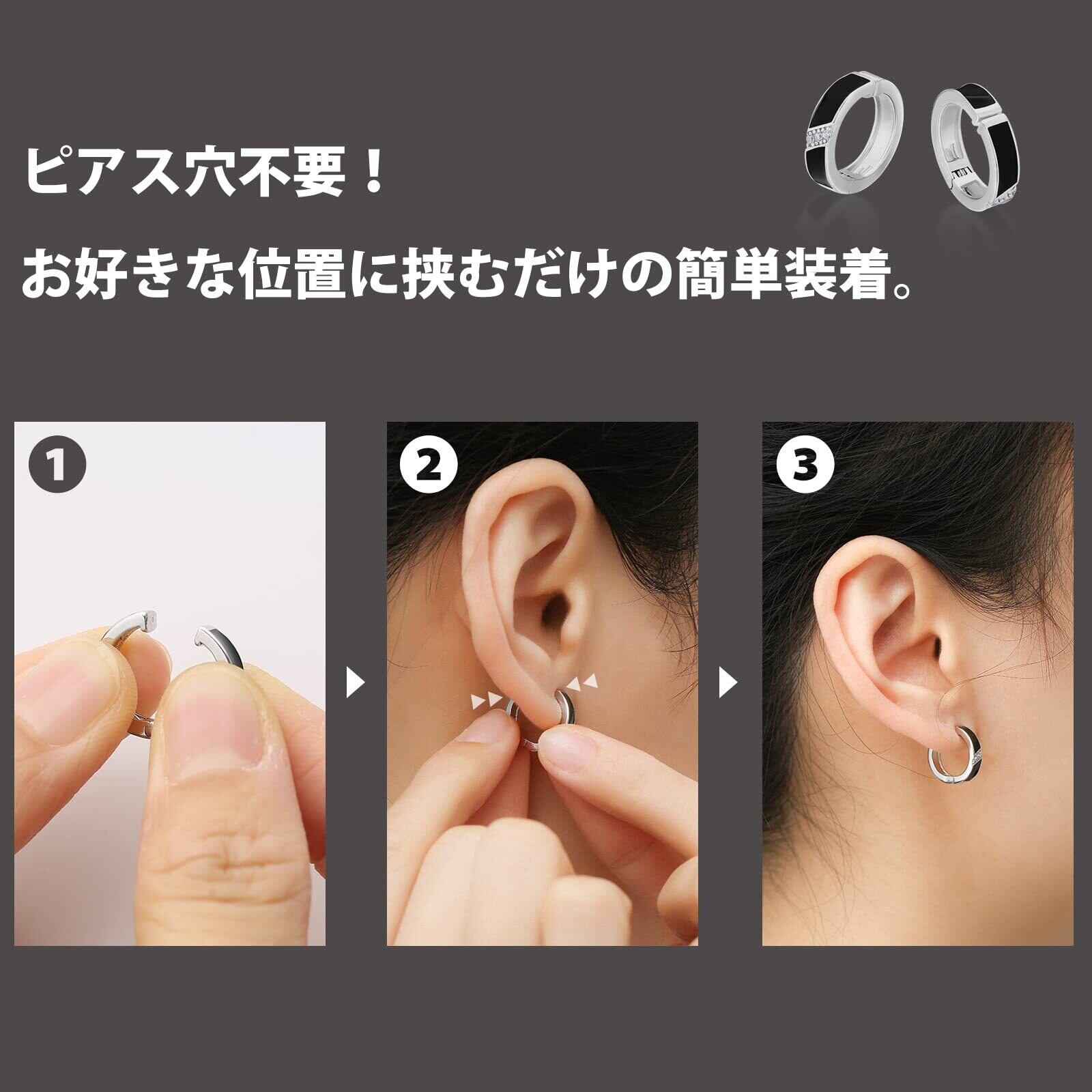 【ピアス穴不要のフェイクピアス】挟むだけで簡単に着脱できるフープ型イヤリング。ピアス穴が開いていなくても、着けたい場所にはさむだけでフープピアスのように見えるフェイクピアスです。定番の耳たぶはもちろん、軟骨部分への装着も可能。