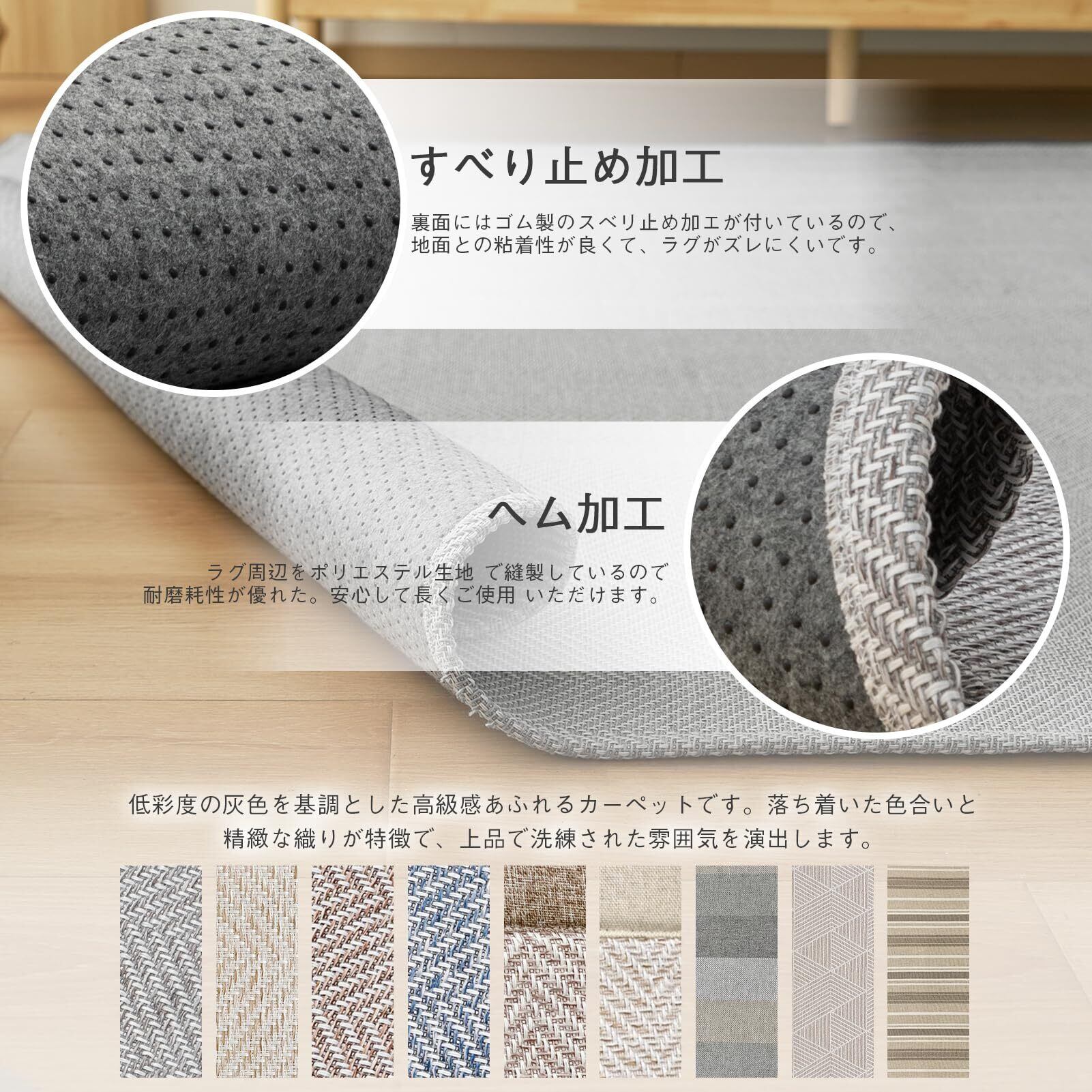 【オールシーズン快適】カーペットの取材は服と同じ繊維を使っているため、適度な厚みで空気をたっぷり含んで断熱します。生地がサラッとした感触なので、夏でも裸足で気持ち良いです。裏面に耐熱加工を施しているので、床暖房のお部屋での使用やホットカーペットカバーとしてもOKです。