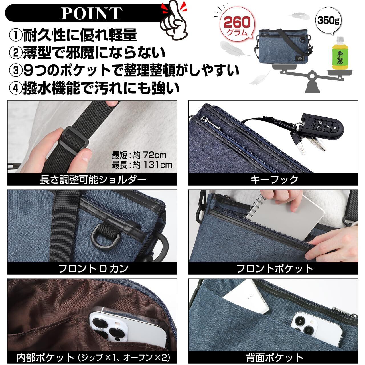 【サイズ】幅27cm×高さ19cm×マチ2cm+2cm【重さ】約260g【素材】防水ポリエステル 【ショルダー】最短:約72cm、最長:約131cm(斜め掛け可能サイズ)