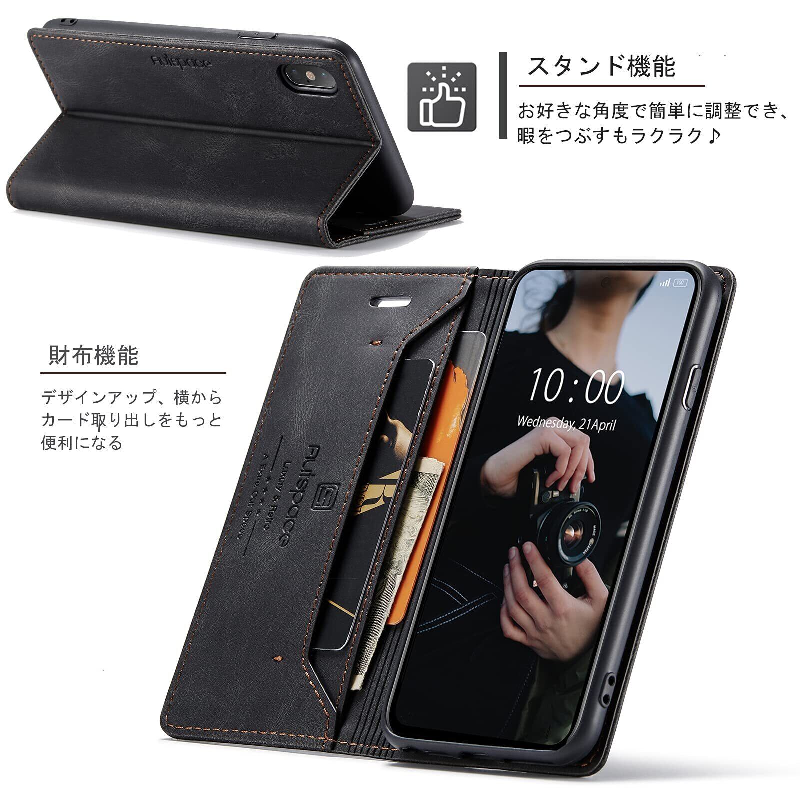 【磁気防止RFID功能 &機能性 4in1】磁気カードを保護するために磁器遮断功能があり、スキミング防止、不正アクセスから大切なクレジットカード、キャッシュカード、IDカードなどの個人情報を守れるRFIDスキミング防止の機能も備えています;①横置きスタンド機能:動画視聴でも手に持つ必要がなく、超楽々動画視聴が可能です;②財布型:ケースの裏側に一つのカードポケットとお札入れのフリーポケット一つあり、ショップでのポイントカード、交通機関でのスムーズな移動をサポートでき、 SUICA / PASMO / ポイントカード / メモ 等収納でき、ちょっととしたお出かけてもこれで十分です;③留め具なし、マグネット内蔵 ベルトなし、片手でも簡単操作できる;④ストラップホールはTPUケースの右下にあり、お好きなストラップを使用し、生活にもっと便利になり、または各種ボタンの使用、カメラ撮影、スピーカーホール等、すべての機能もそのまま立て掛けて稼働します;