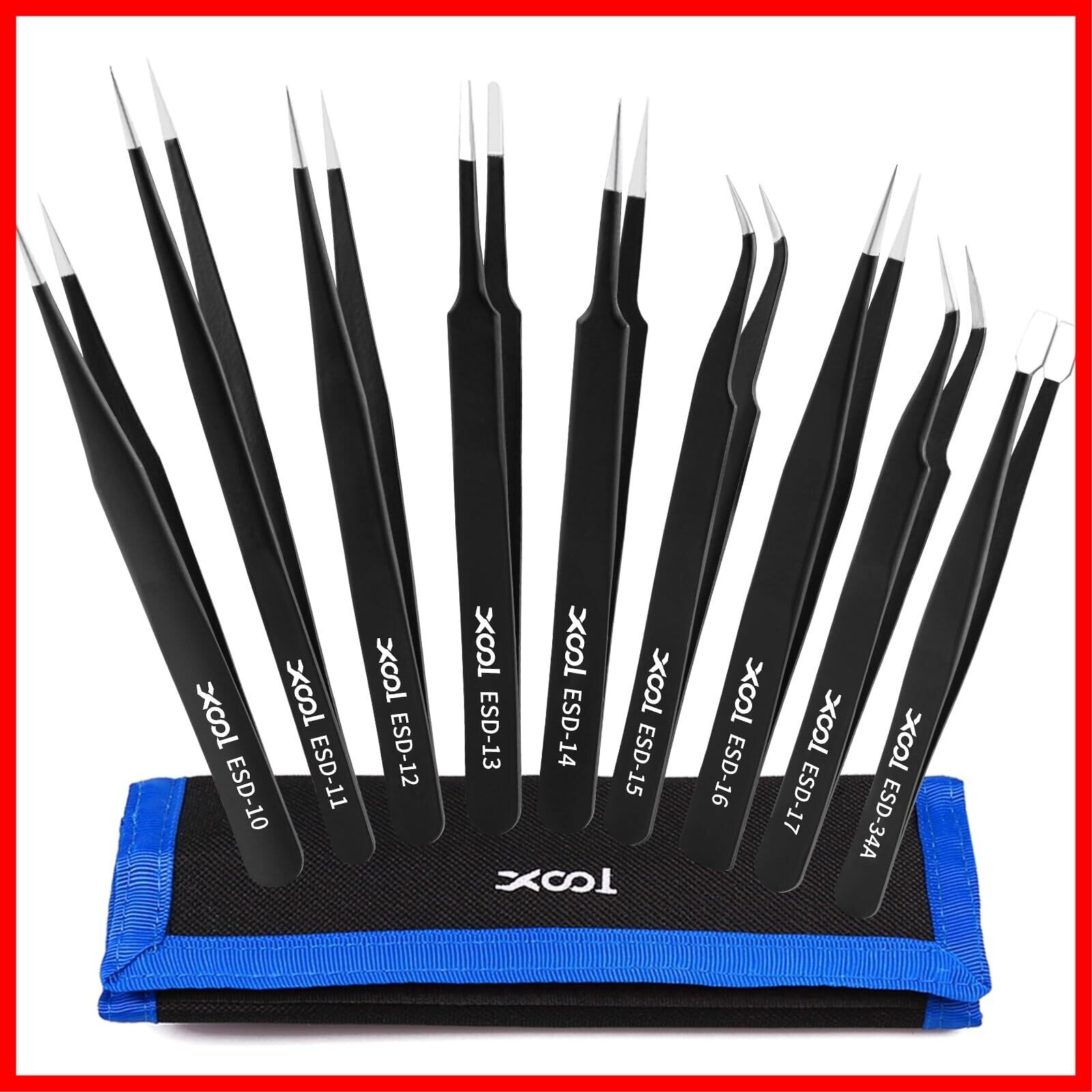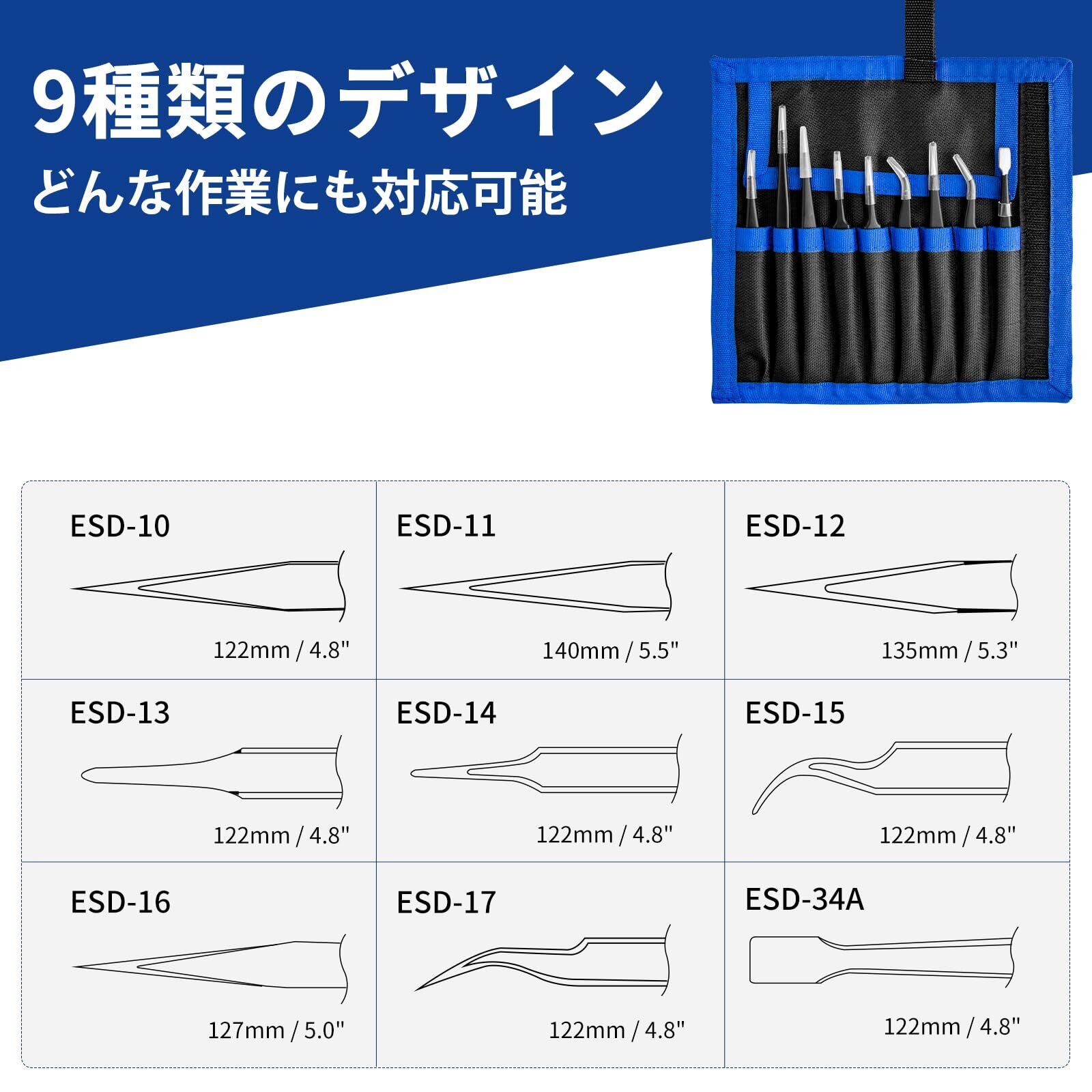 XOOL 精密ピンセット 9本セット ESD 静電防止 ステンレス製 ツイーザー 電子機器修理 宝石製作 ネイルアート用 収納袋付き