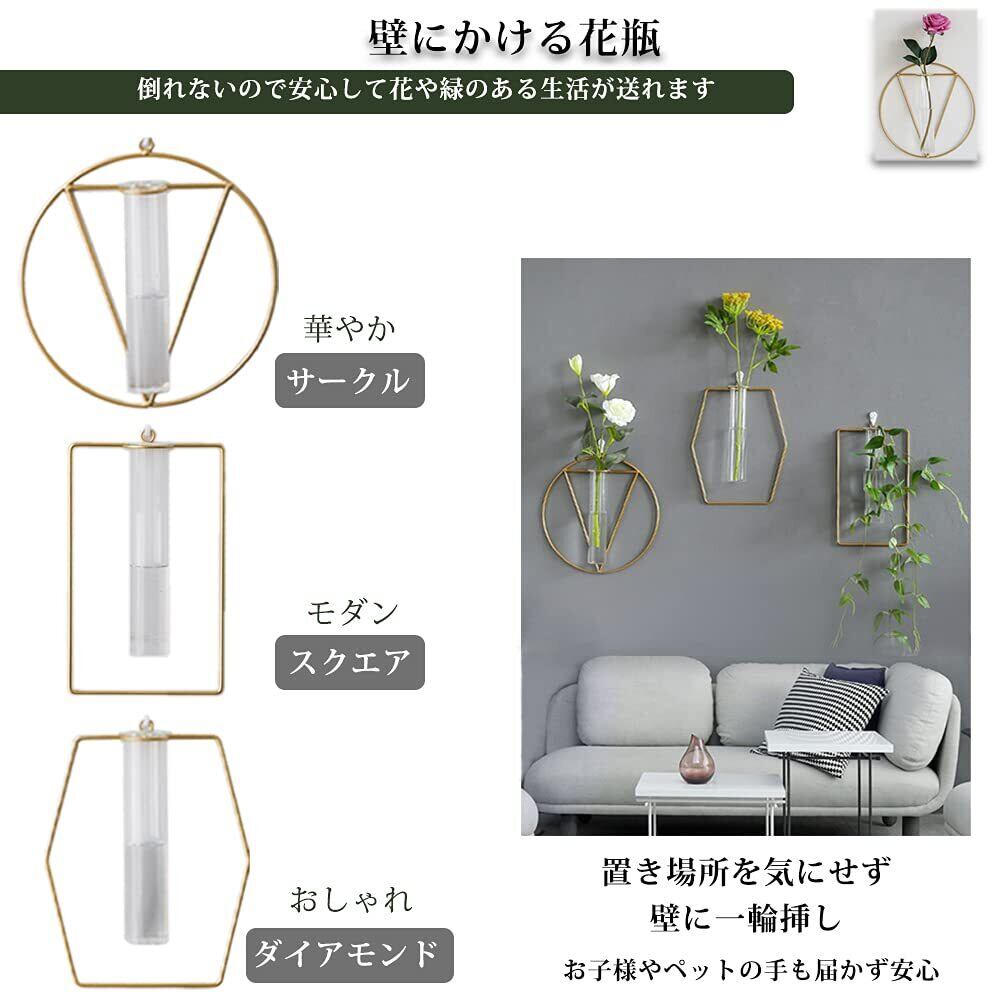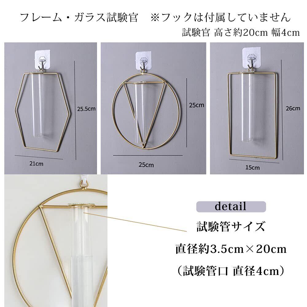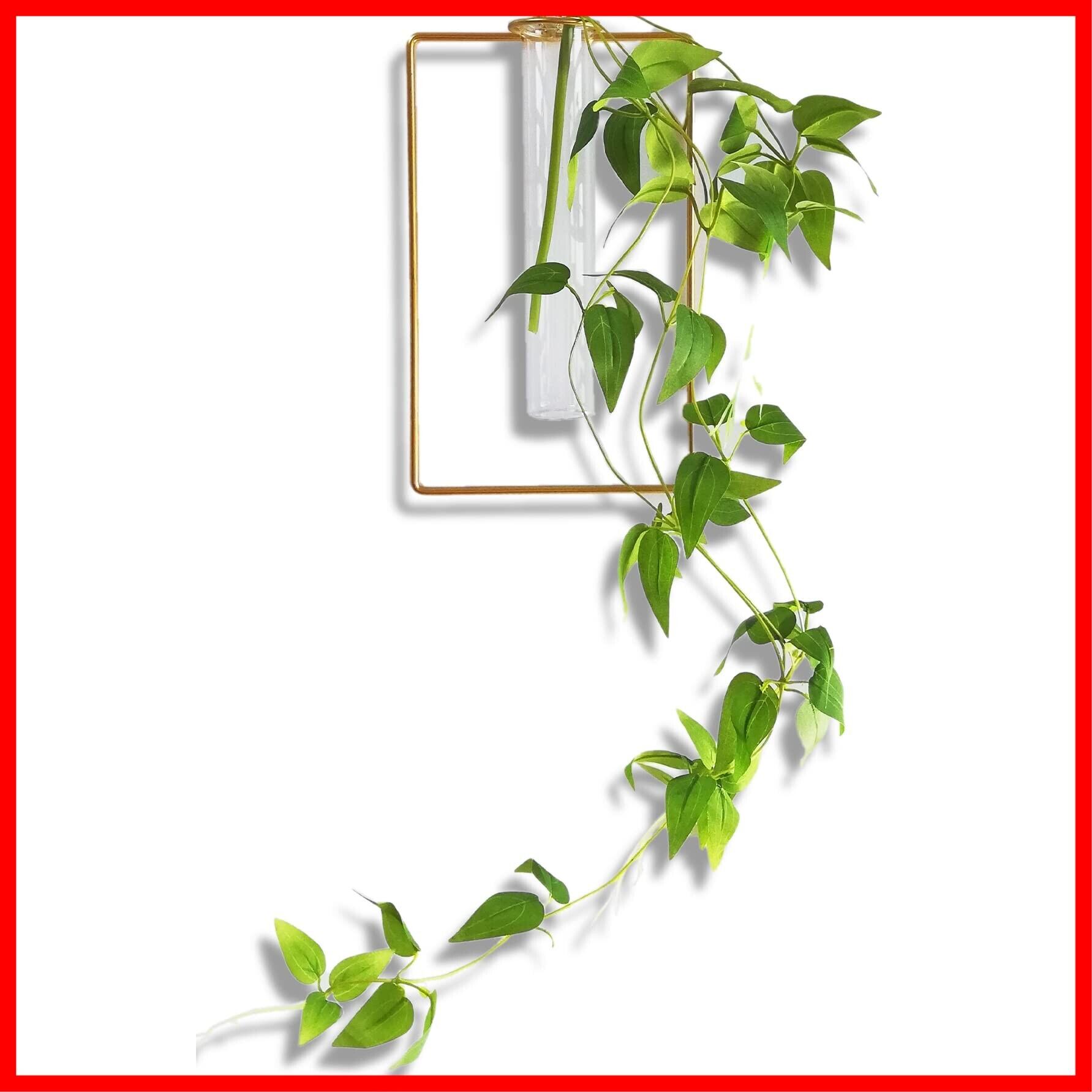 透明なガラス試験官の壁に掛けるタイプの花瓶(一輪挿し)。植物つきのタイプはくるくる吊り下がる 人口観葉植物 のセット。ゴールドフレームつきの高級感あるインテリア雑貨でおすすめです。