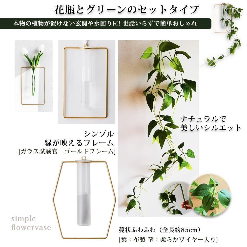 【植物つきタイプ】ガラス管花瓶(直径約3.5cm×20cm)とアイアン、釣り下げシルエットの素敵なフェイクグリーンのセット商品です。