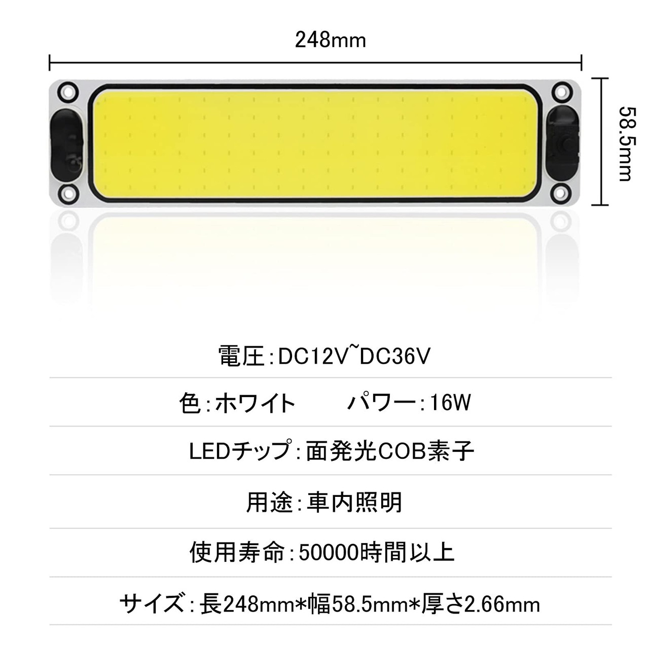 【商品仕様】極薄 トラック マーカーランプ / 色:ホワイト / セット数:4本 / 電圧:DC12V~DC36V / 使用寿命:50000時間以上 / LEDチップ:面発光COB素子 / パワー:16W / 防水 / サイズ:長248mm*幅58.5mm*厚さ2.66mm