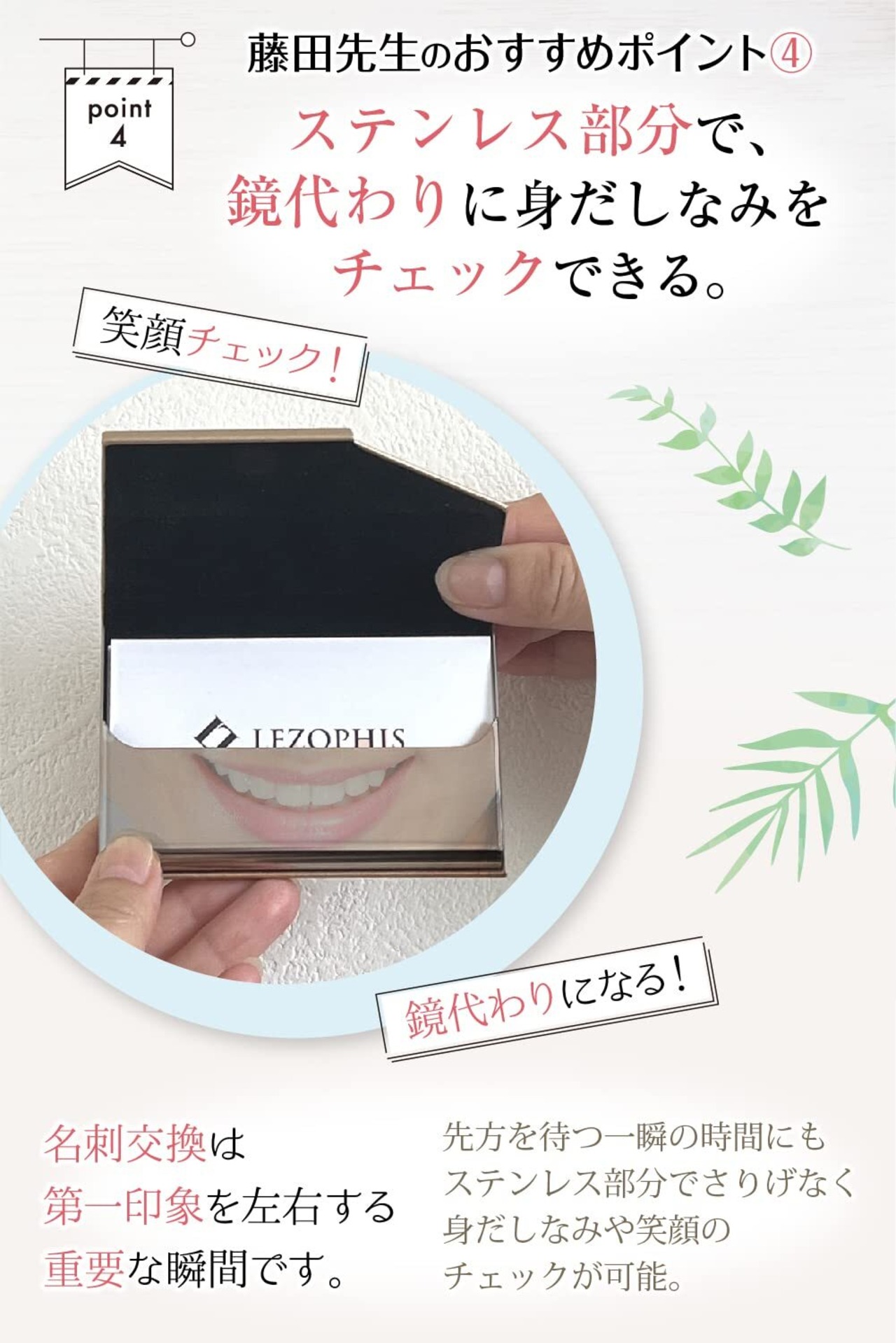 おすすめポイント④ ステンレス部分で、鏡代わりに使うことができるので、身だしなみや笑顔のチェックも可能です。