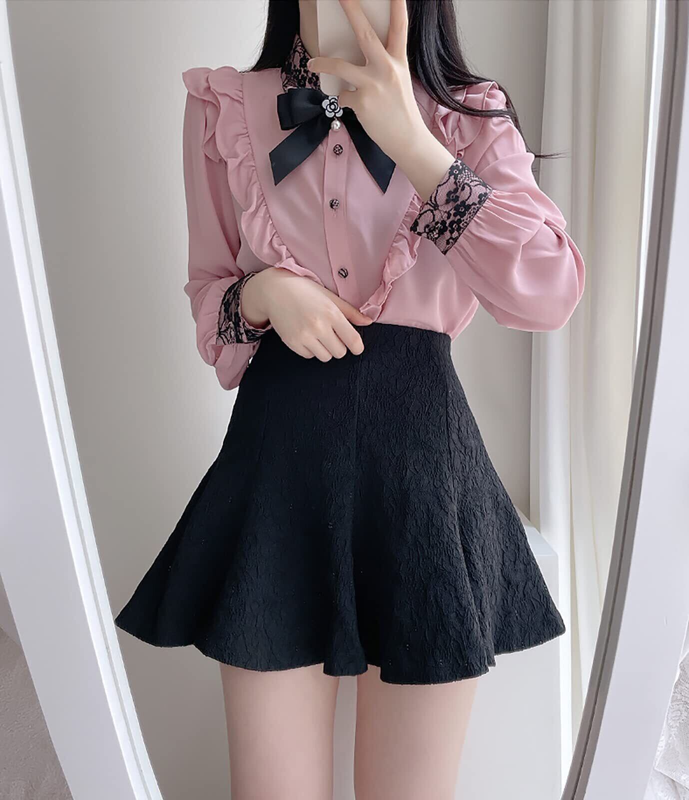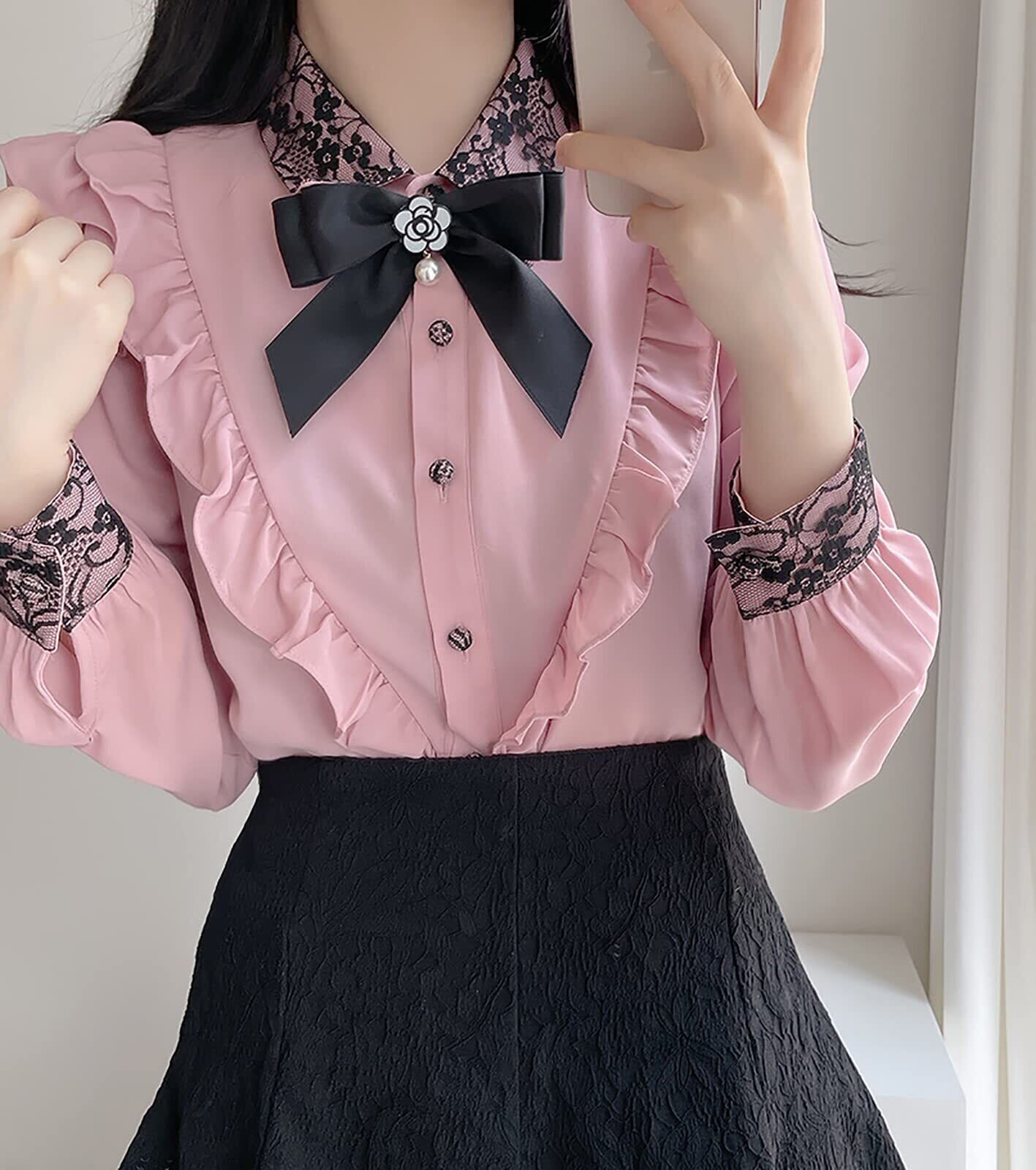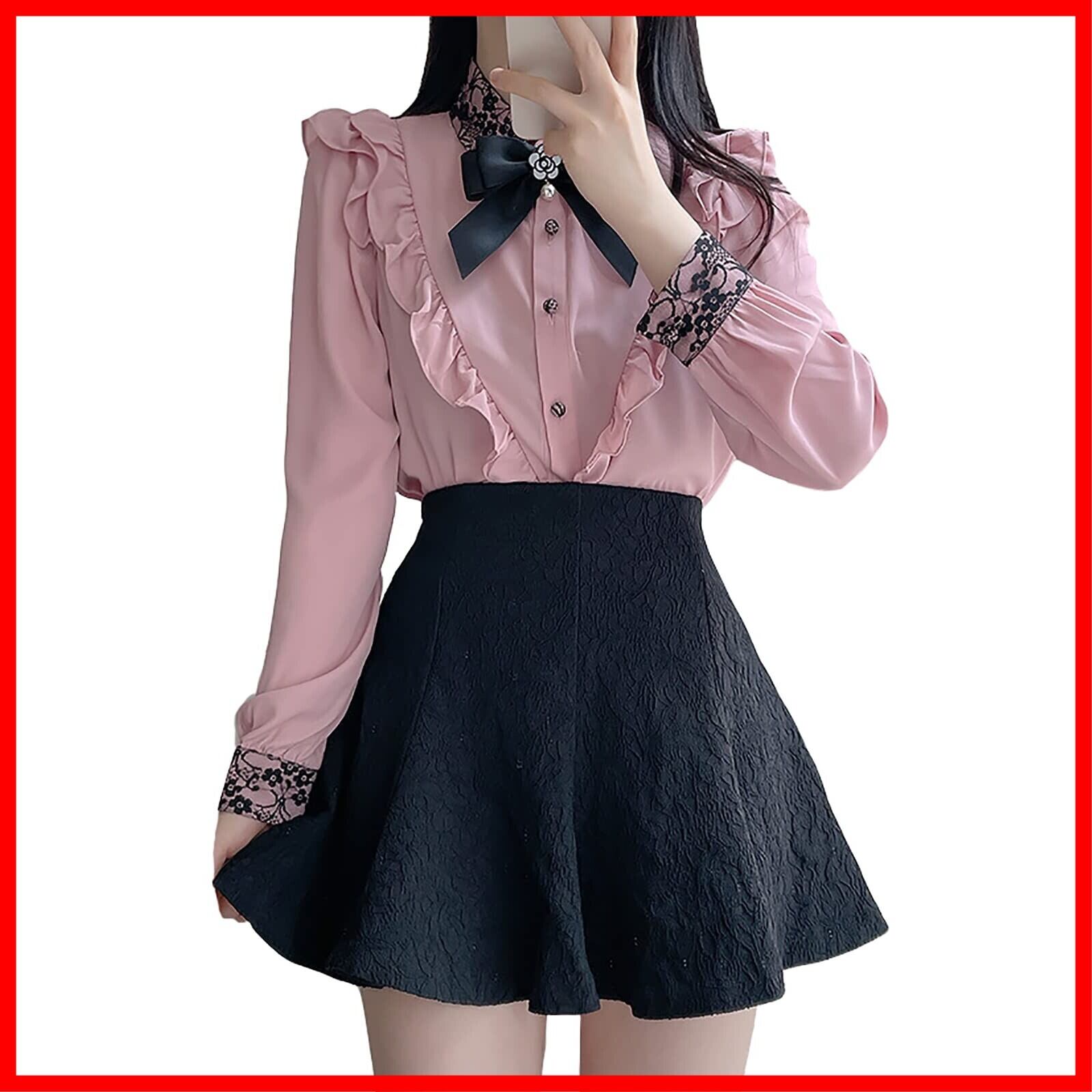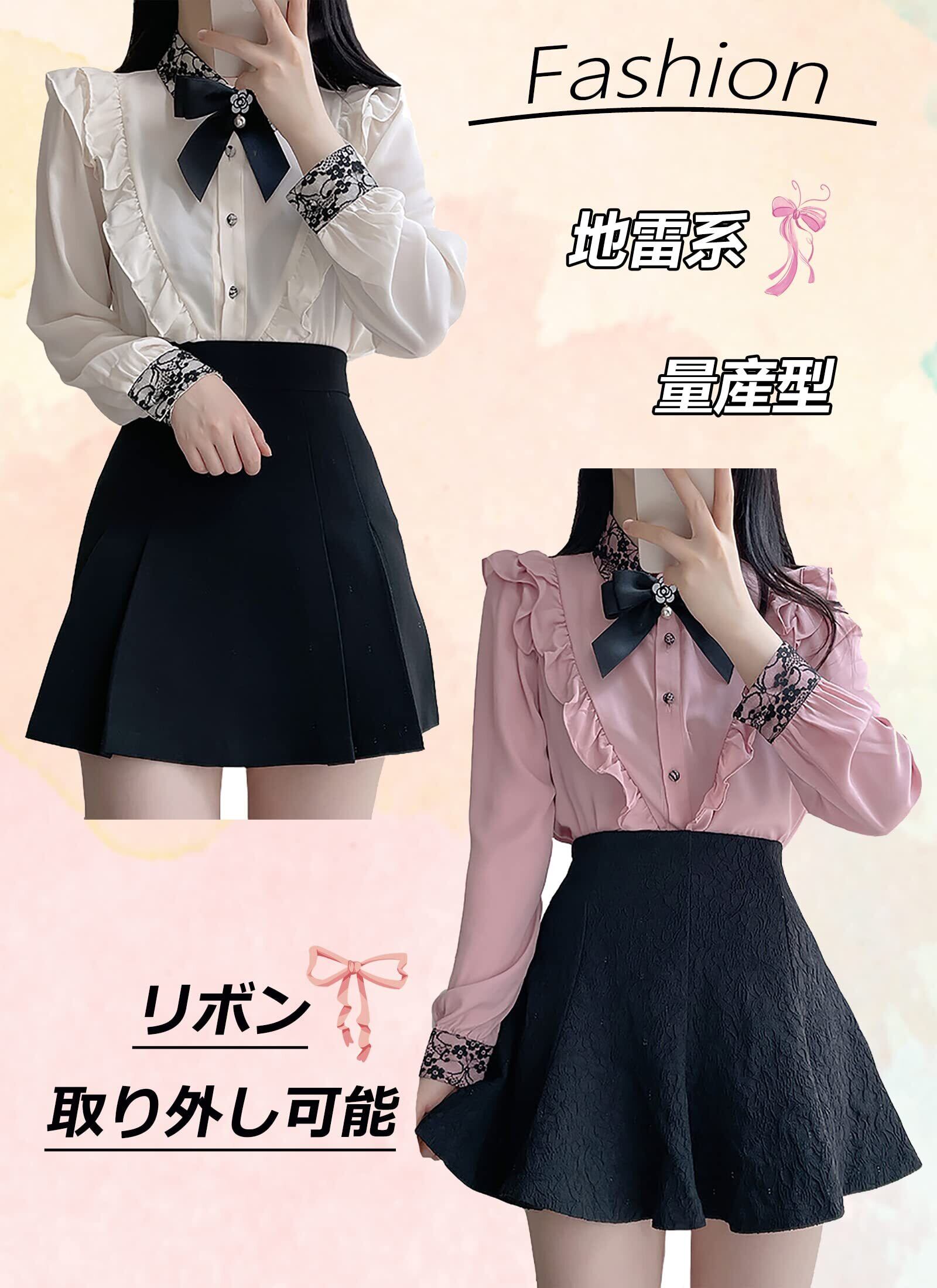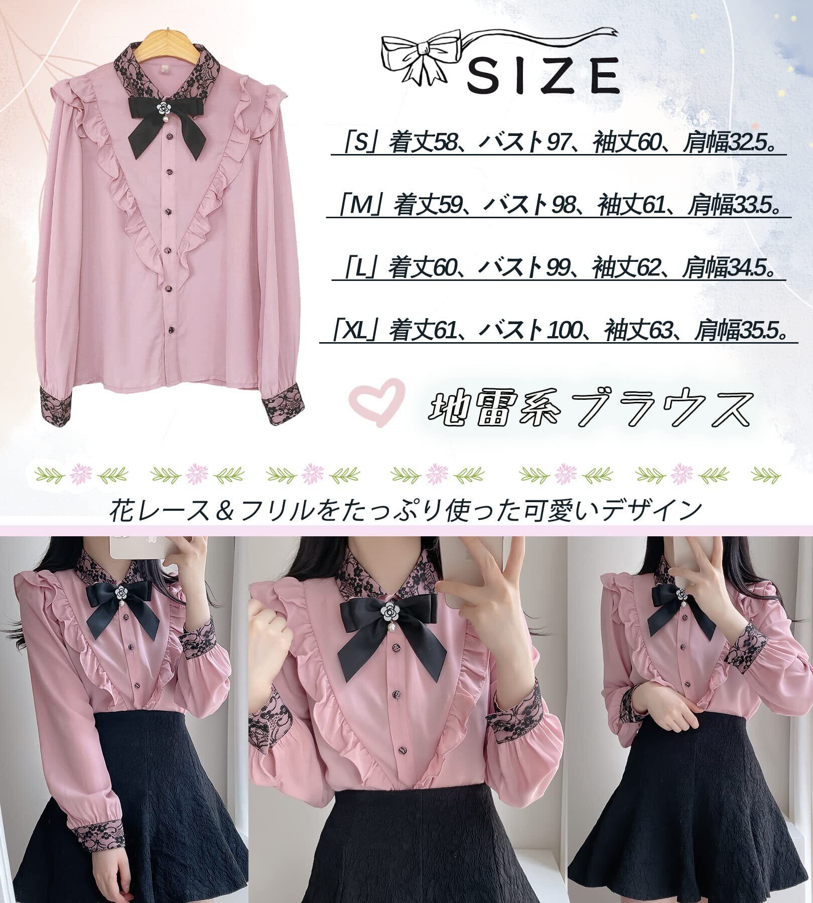 地雷系 かわいい ブラウス レディース 量産型 リボン フリル 花柄 レース 長袖 レディースブラウス シャツ 大人 フェミニン おしゃれ 春 夏 秋 ピンク M