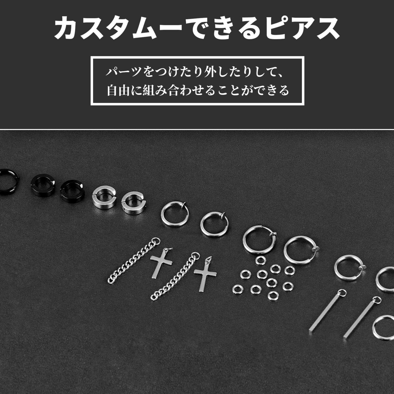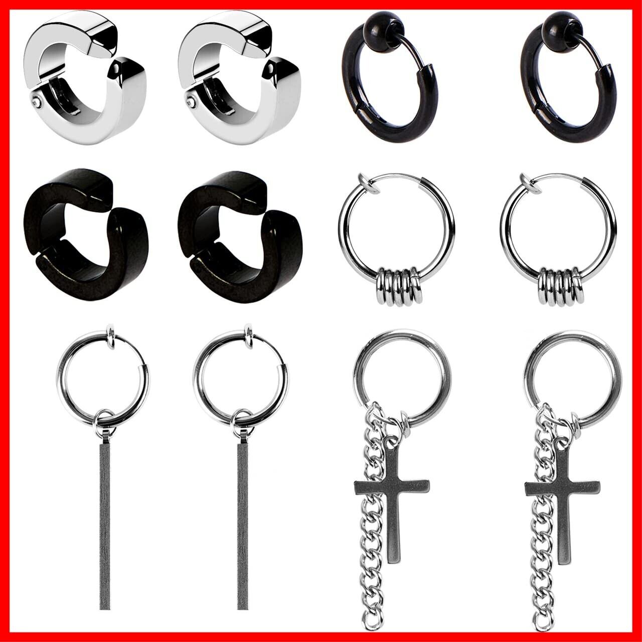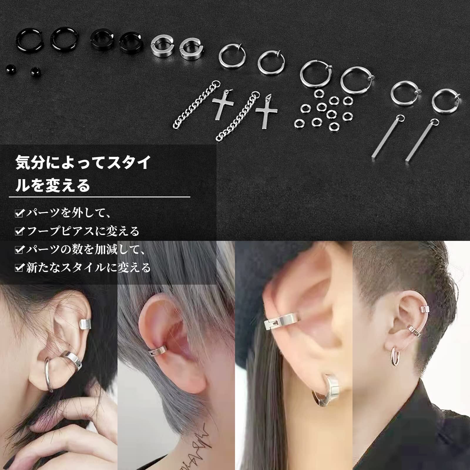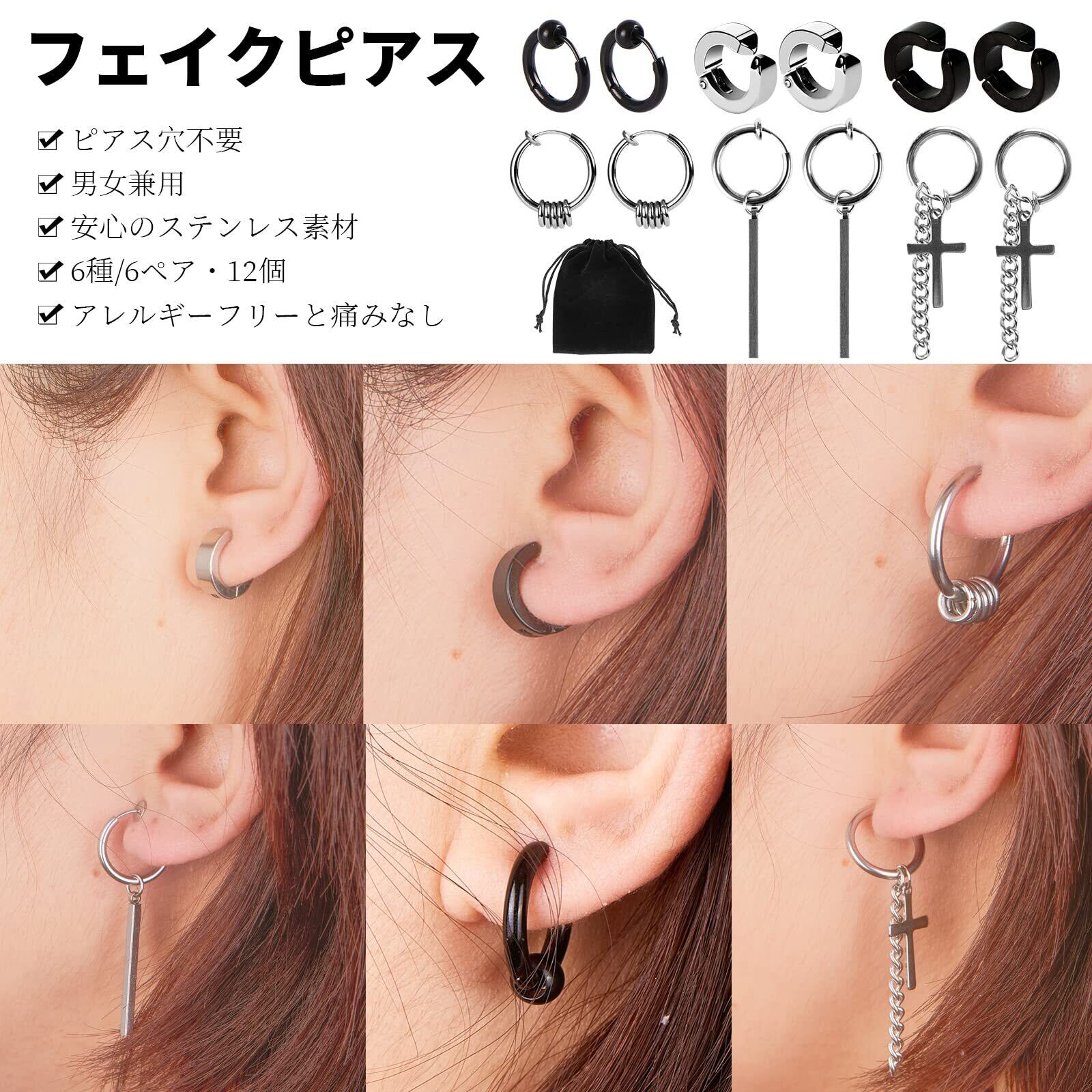 【お得なフェイクピアスメンズセット】ノンホールでもオシャレに楽しめるメンズイヤリングです。6ペア、合計12個で、イヤリングのパーツは付けたり、外したりできるし、リングとパーツのサイズもそれぞれ違いますし、自由に組み合わせることによって異なるスタイルを楽しめます。イヤリングをペアでつけたり、片耳だけで付けたり、重ね付けたり、ブラックととシルバー色違いで付けたりして、フープピアス、イヤーカフ、軟骨ピアスなどとして10個以上の付け方法があります。どんなファッションにも合わせやすく、個性的で自分の魅力さを十分に表せるノンホールピアス メンズです。