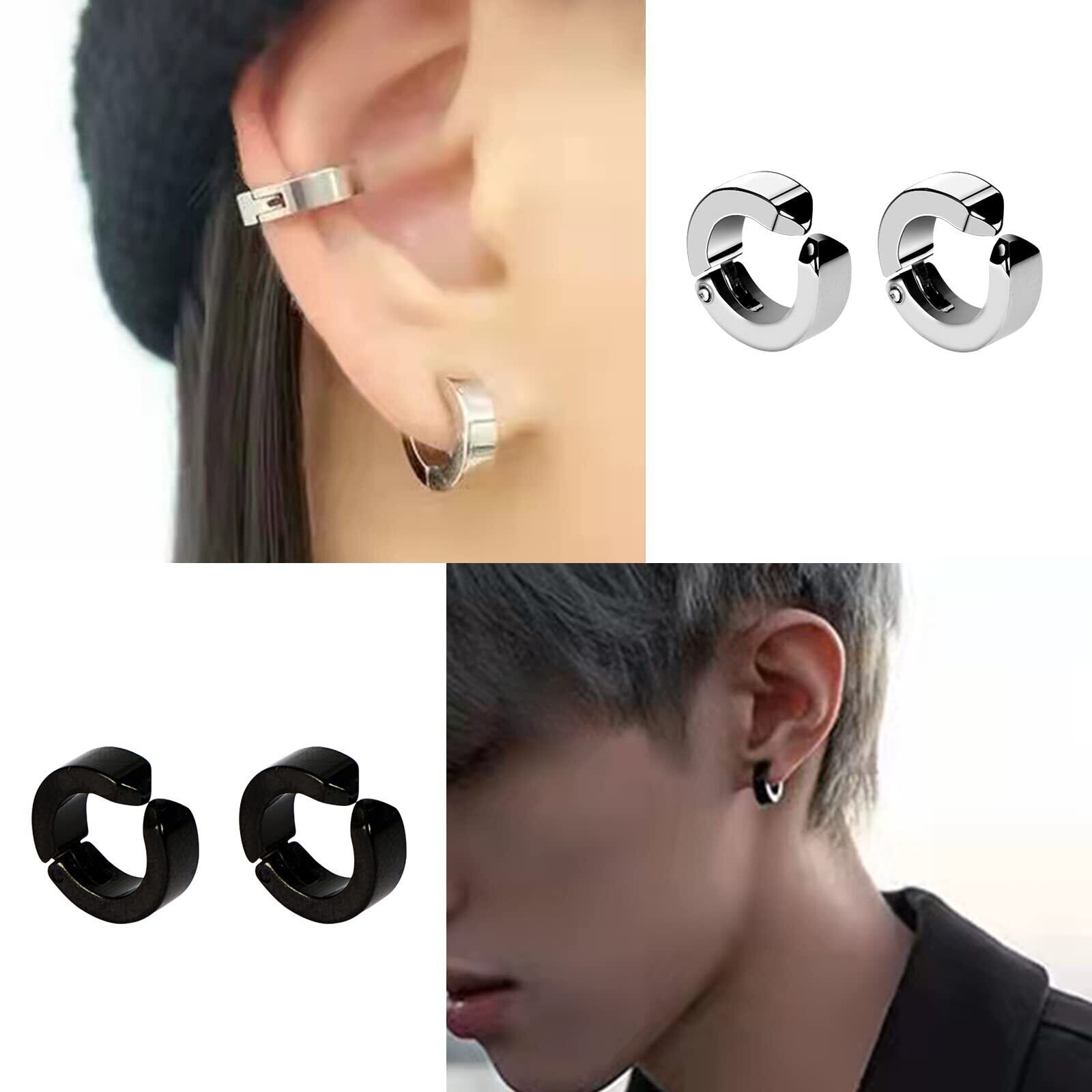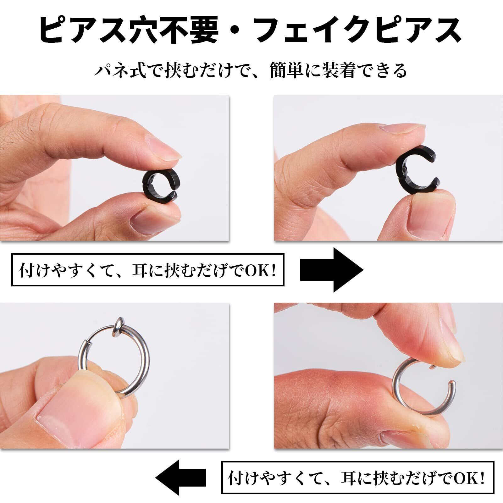 【ピアス穴必要なし】耳に挟むフープピアスタイプのイヤリングで、ピアス穴を開ける必要です。ピアス穴を開けるのを躊躇しているメンズとレディース、平日職場や学校の関係で、イヤリングが禁止されている職場人、ジュニア、学生にぴったりピアスセットです。その日のコーデや気分に合わせて、気に入ったスタイルで楽しめます。シンプルで、ユニセックスデザインで、バネタイプなので挟むだけで簡単に簡単に脱着でき、お洒落を楽しめるメンズ用とレディース用イヤリングです。
