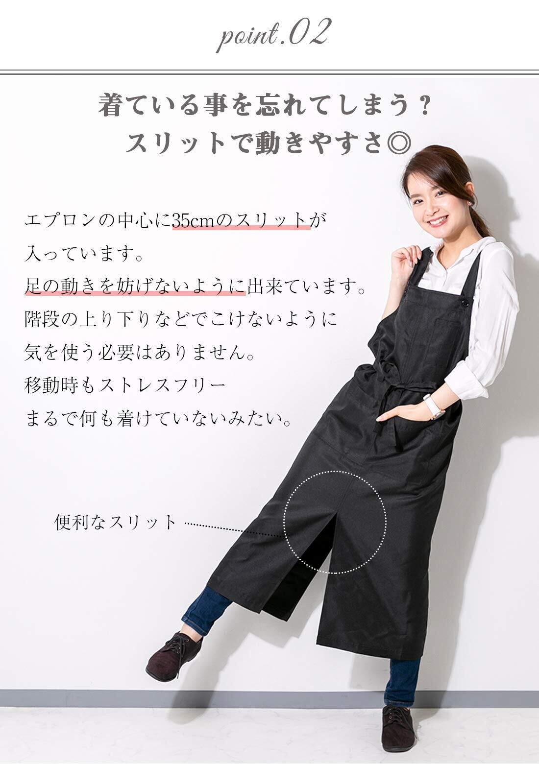 着ている事を忘れてしまう?スリットで動きやすさ◎→エプロンの中心に35cmのスリットが入っています。足の動きを妨げないように出来ています。階段の上り下りなどでこけないように気を遣う必要はありません。移動時もストレスフリー。まるで何も着けていないみたい。