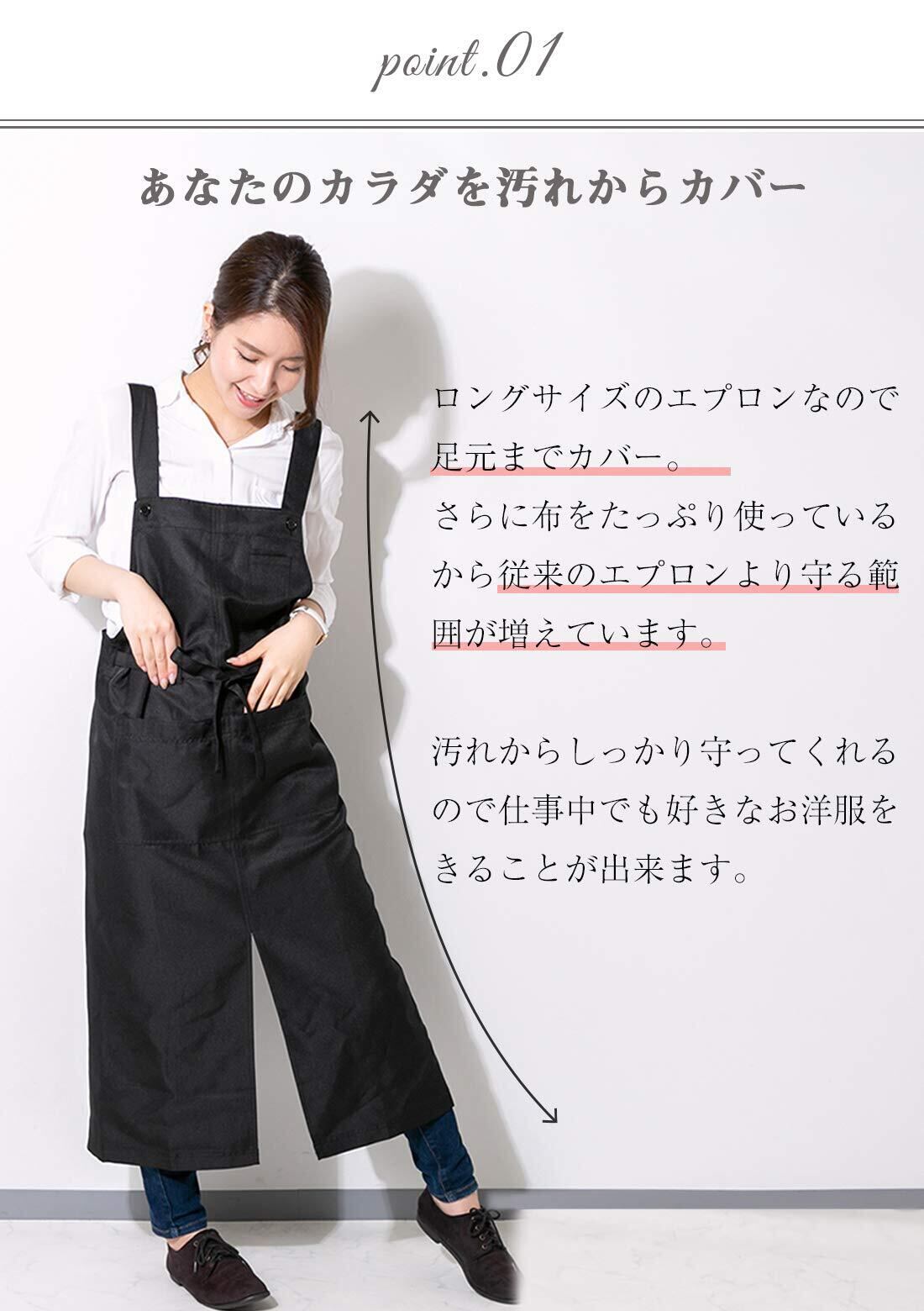 あなたのカラダを汚れからカバー→ロングサイズのエプロンなので足元までカバー。さらに布をたっぷり使っているから従来のエプロンより守る範囲が増えています。汚れからしっかり守ってくれるので仕事中でも好きなお洋服をきることが出来ます。