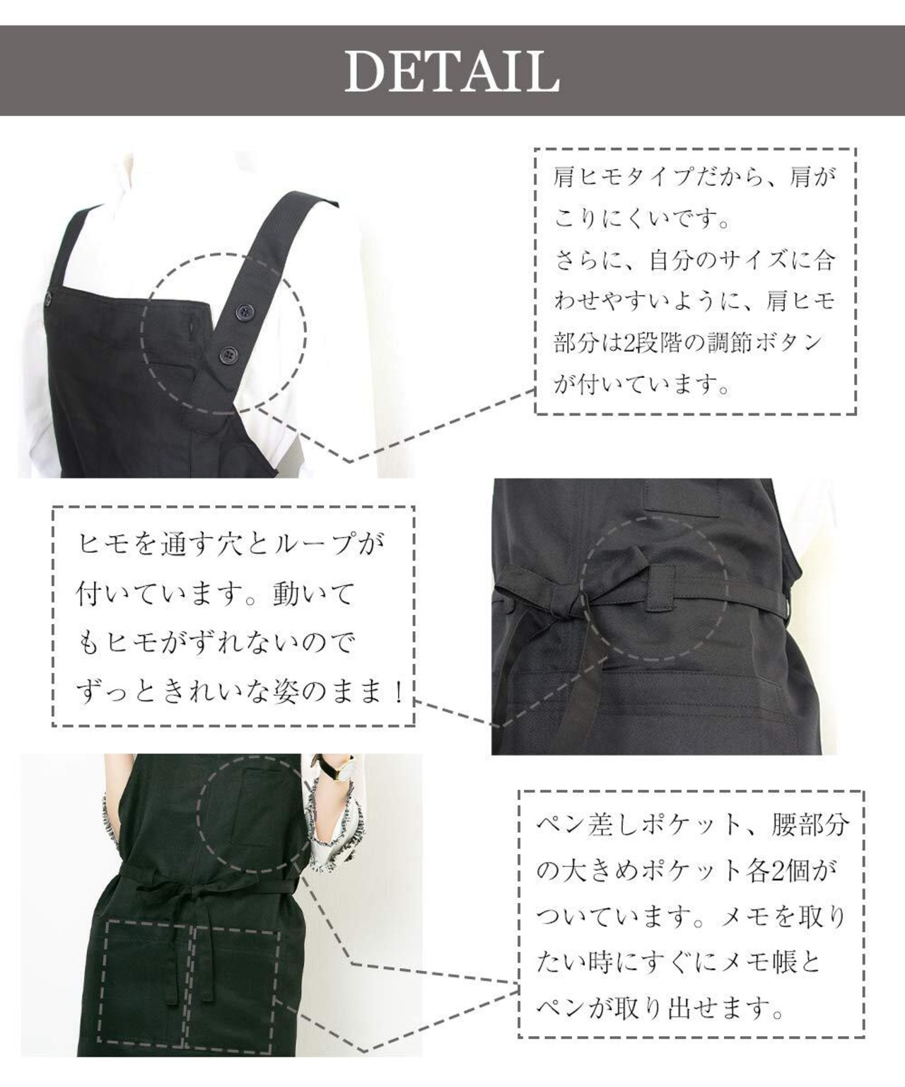 肩ヒモタイプだから、肩がこりにくいです。さらに、自分のサイズに合わせやすいように、肩ヒモ部分は2段階の調節ボタンが付いています。 ヒモを通す穴とループが付いています。動いてもヒモがずれないので、ずっときれいな姿のまま。