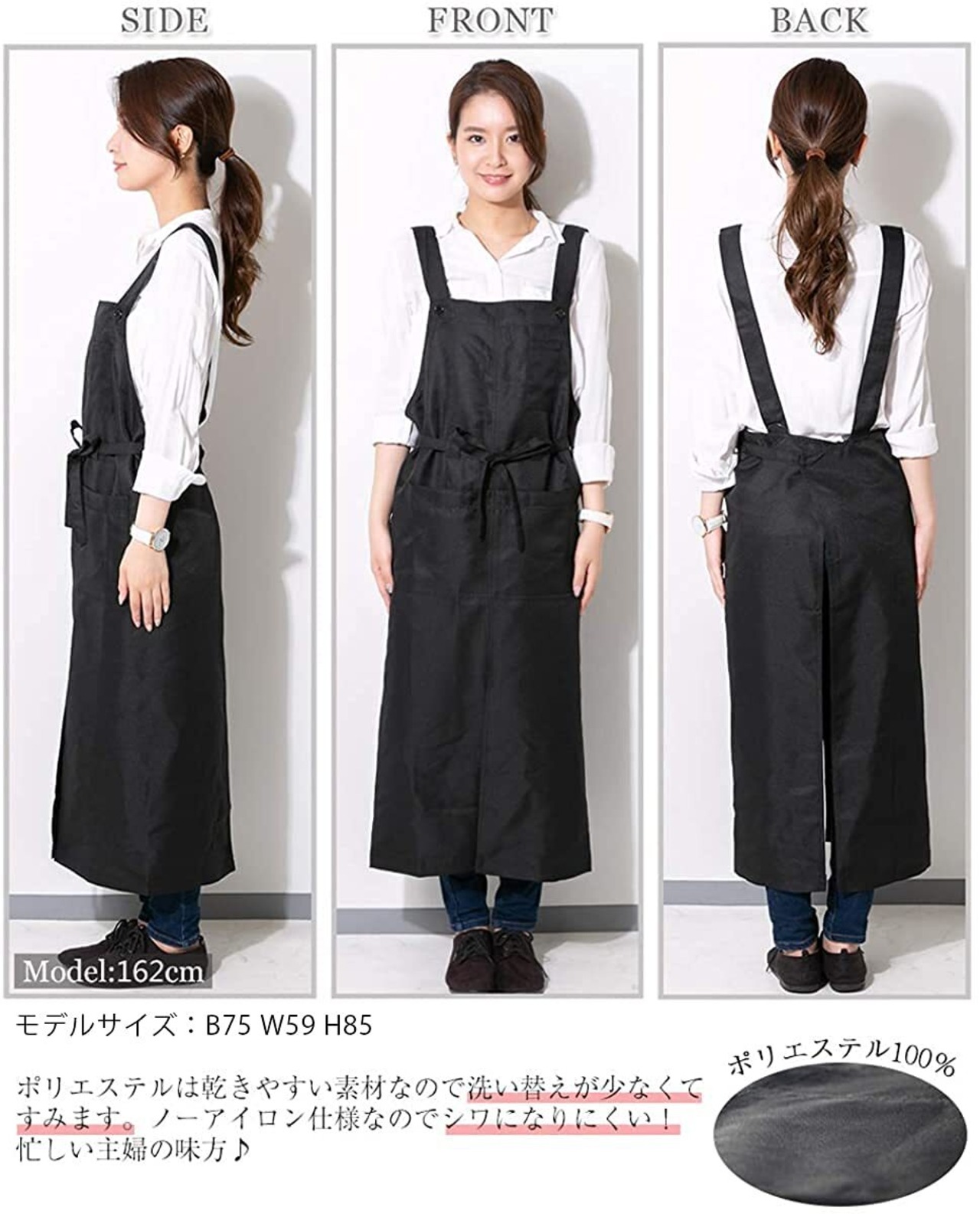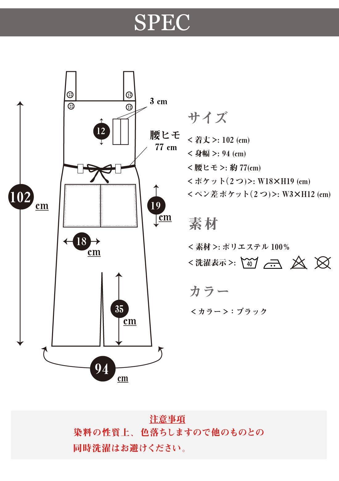 サイズ:フリー(M~L) 着丈:102cm 身幅:94cm 腰ヒモ:約77cm ポケット×2:W18cm×H19cm ペン差しポケット×2:W3×H12cm 素材:ポリエステル100% 乾きやすい素材なので、洗い替えも少なくすみます。シワになりにくいノーアイロン仕様。忙しい主婦の味方です。 ※注意事項:染料の性質上、色落ちしますので他のものとの同時洗濯はお避けください。