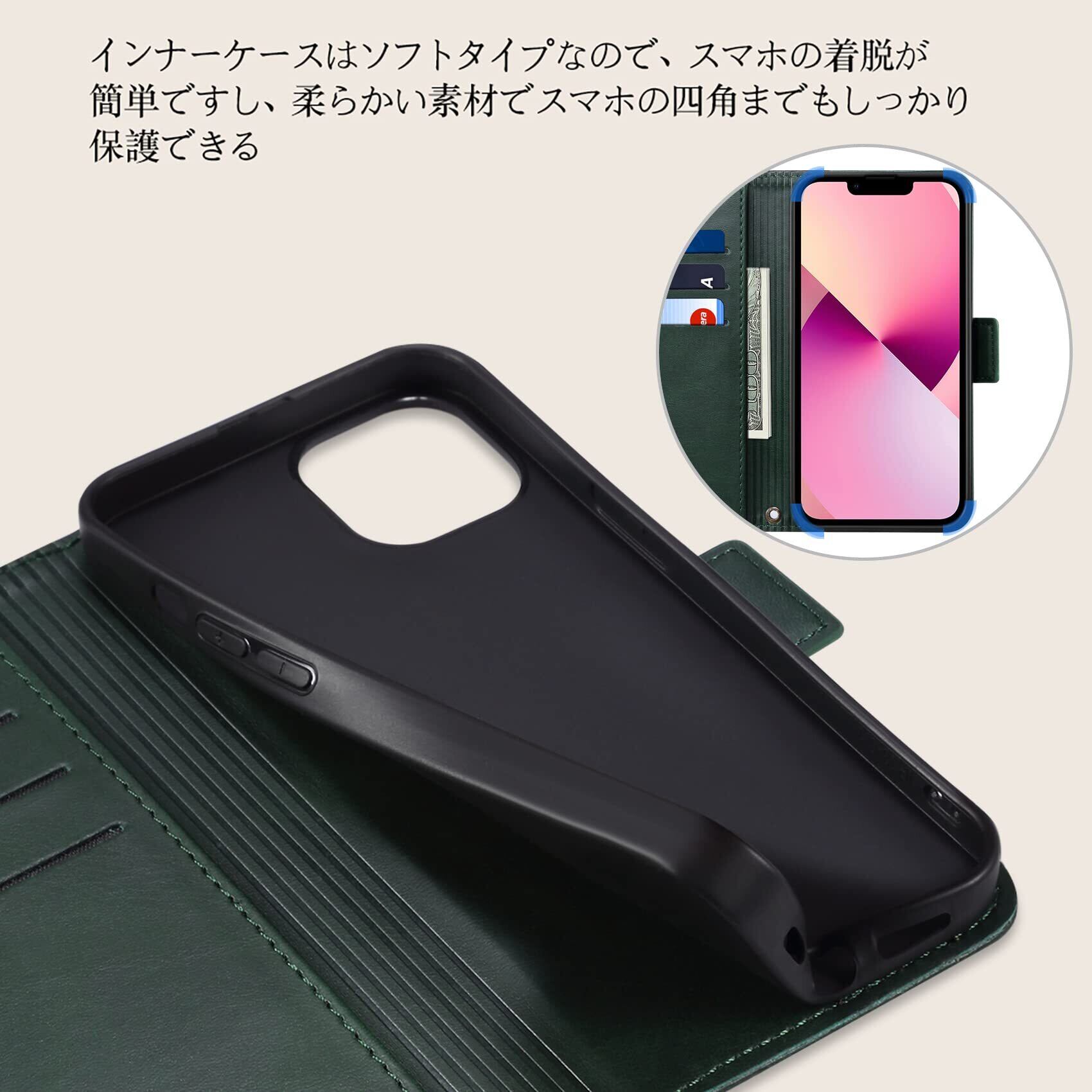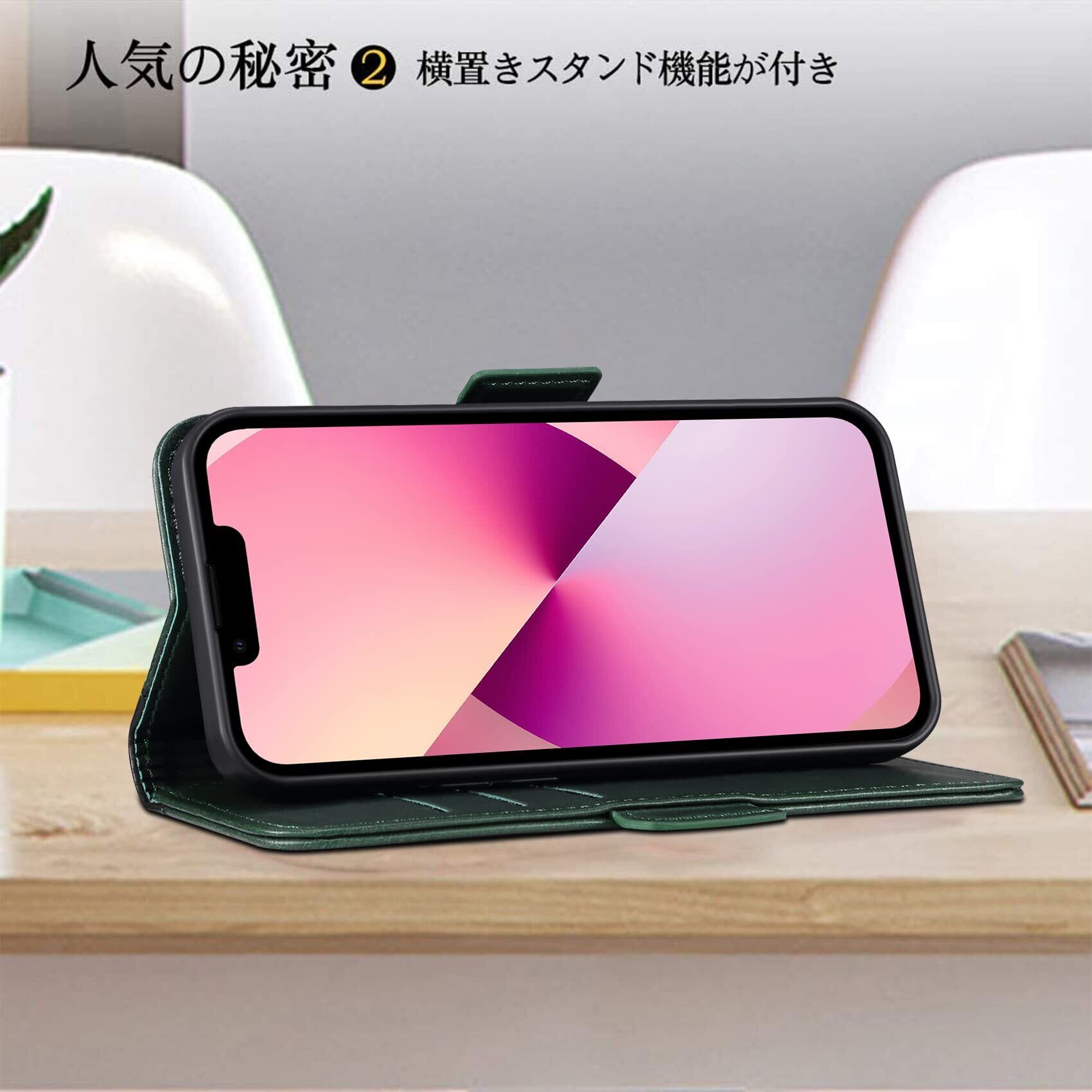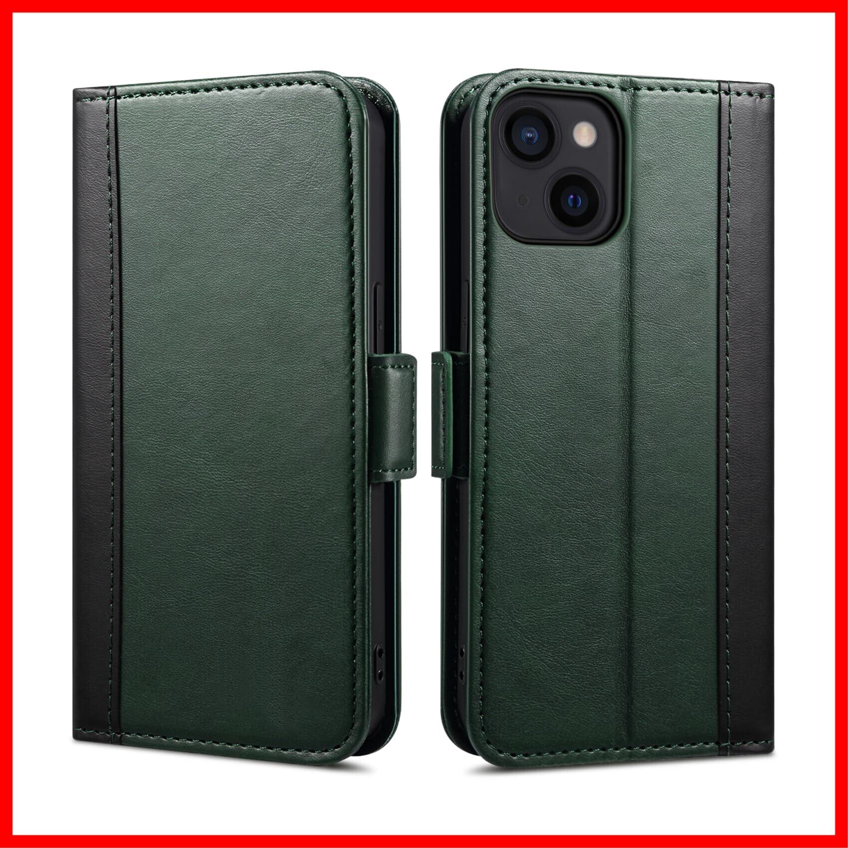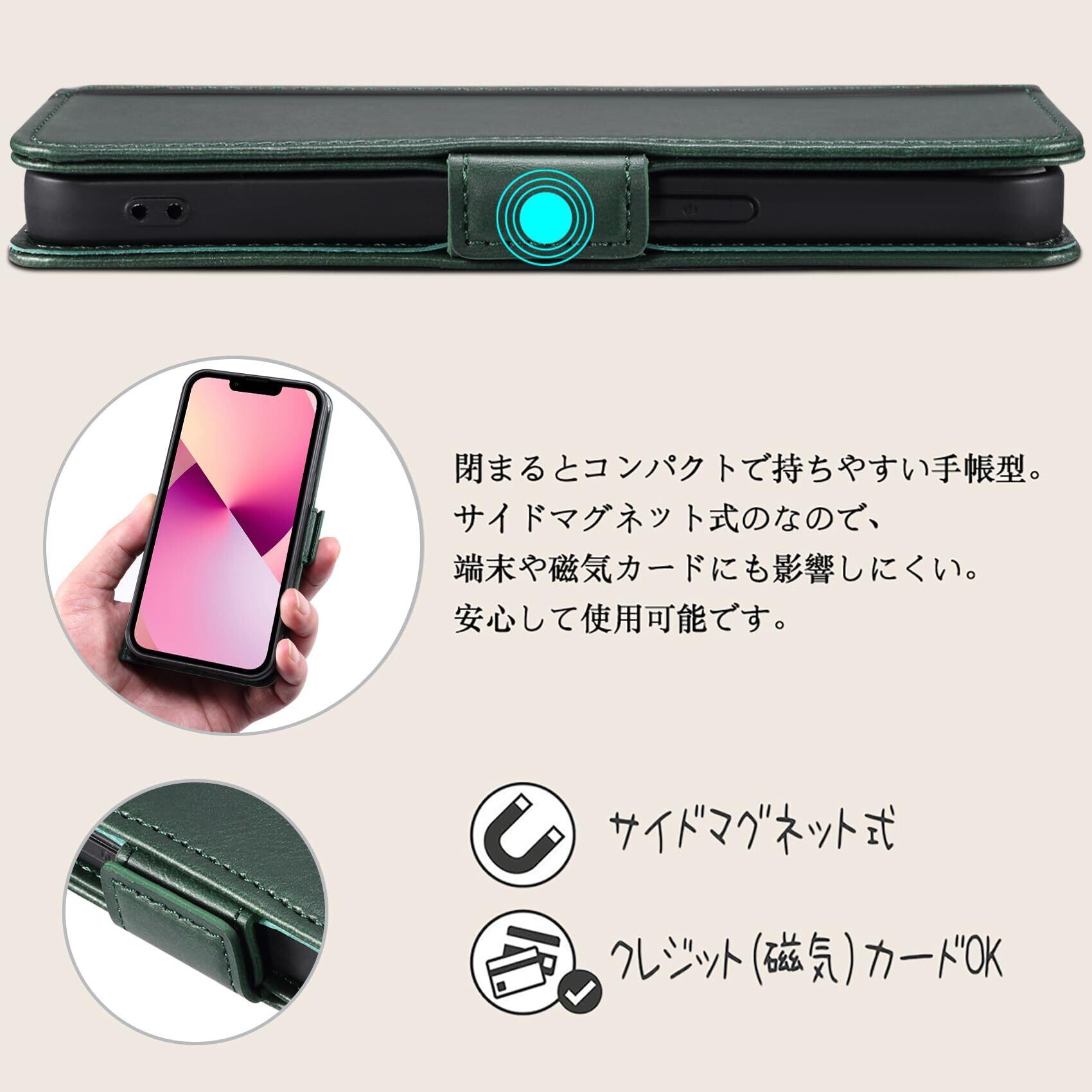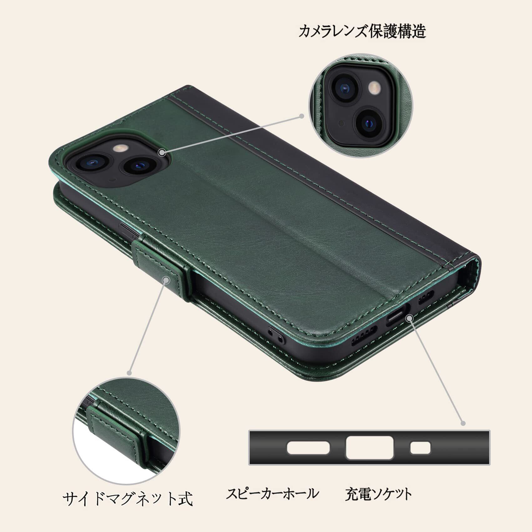 Rssviss iPhone 13 手帳型ケース カード収納 スタンド機能 スマホケース 全面保護 衝撃吸収 サイドマグット付き 財布型 カバー 6.1インチ対応 グリーン