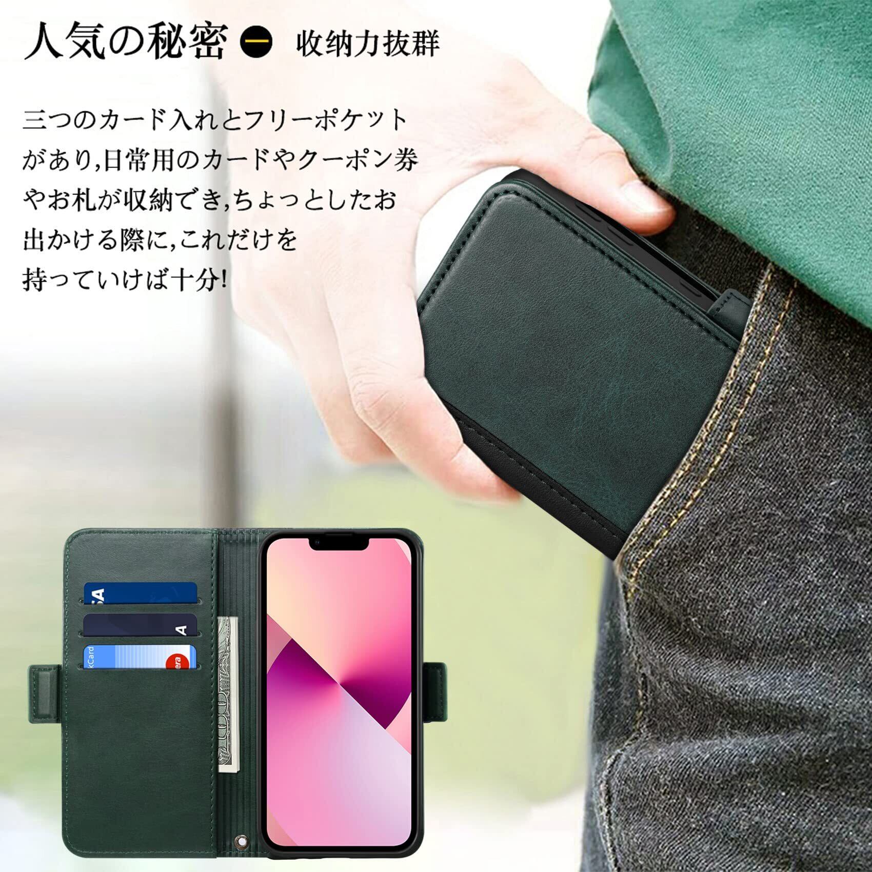 横置きスタンドと収納力:横置きスタンド機能が付いて、好きな角度で動画鑑賞や読書などを楽しめます。アイフォン13のブック型ケースとして、内側には三つのカード入れとフリーポケットがつき、名刺や定期券の収納に優れているiPhone13の手帳型ケースです。
