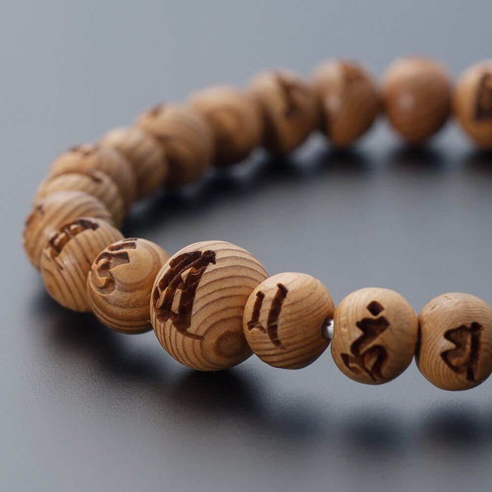 世界遺産でもある屋久島に自生する屋久杉に、「光明真言(こうみょうしんごん)」を彫り込んだ腕輪念珠(ブレスレット)です。屋久杉は現在、伐採が禁止になっており、台風などで倒れた倒木など一部のみ採取が許可されている稀少な高級素材になります。1000年以上も過酷な自然環境の中で生き続ける屋久杉は、自らの身を守るため豊富な樹脂分を持ち、その樹脂分が癒しの香りを放ちます。