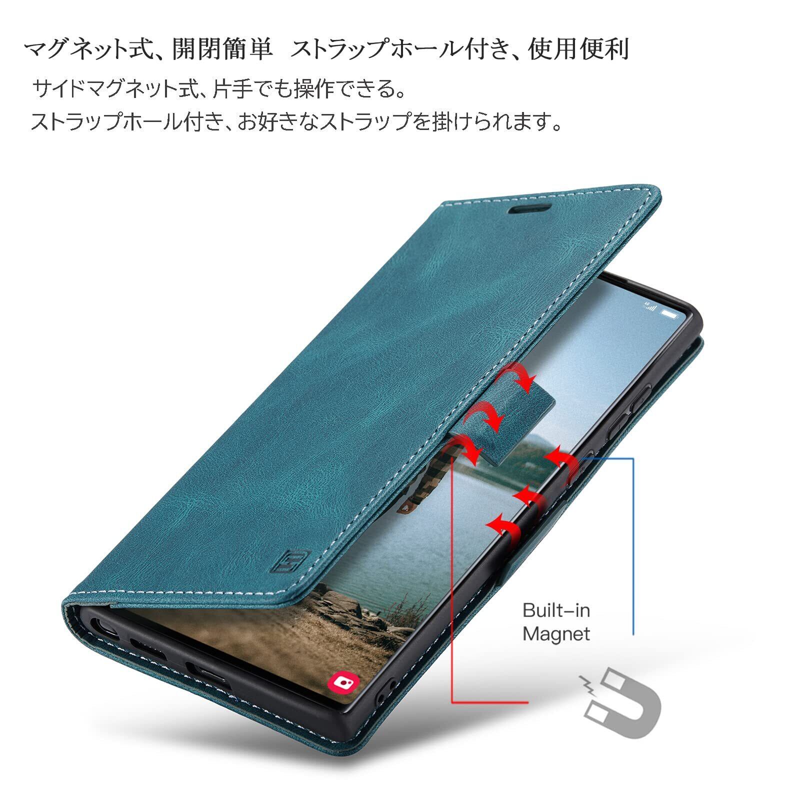 【磁気防止RFID功能 &機能性 4in1】磁気カードを保護するために磁器遮断功能があり、スキミング防止、不正アクセスから大切なクレジットカード、キャッシュカード、IDカードなどの個人情報を守れるRFIDスキミング防止の機能も備えています;①横置きスタンド機能:動画視聴でも手に持つ必要がなく、超楽々動画視聴が可能です;②財布型:ケースの裏側に一つのカードポケットとお札入れのフリーポケット一つあり、ショップでのポイントカード、交通機関でのスムーズな移動をサポートでき、 SUICA / PASMO / ポイントカード / メモ 等収納でき、ちょっととしたお出かけてもこれで十分です;③留め具なし、マグネット内蔵 ベルトなし、片手でも簡単操作できる;④ストラップホールはTPUケースの右下にあり、お好きなストラップを使用し、生活にもっと便利になり、または各種ボタンの使用、カメラ撮影、スピーカーホール等、すべての機能もそのまま立て掛けて稼働します;