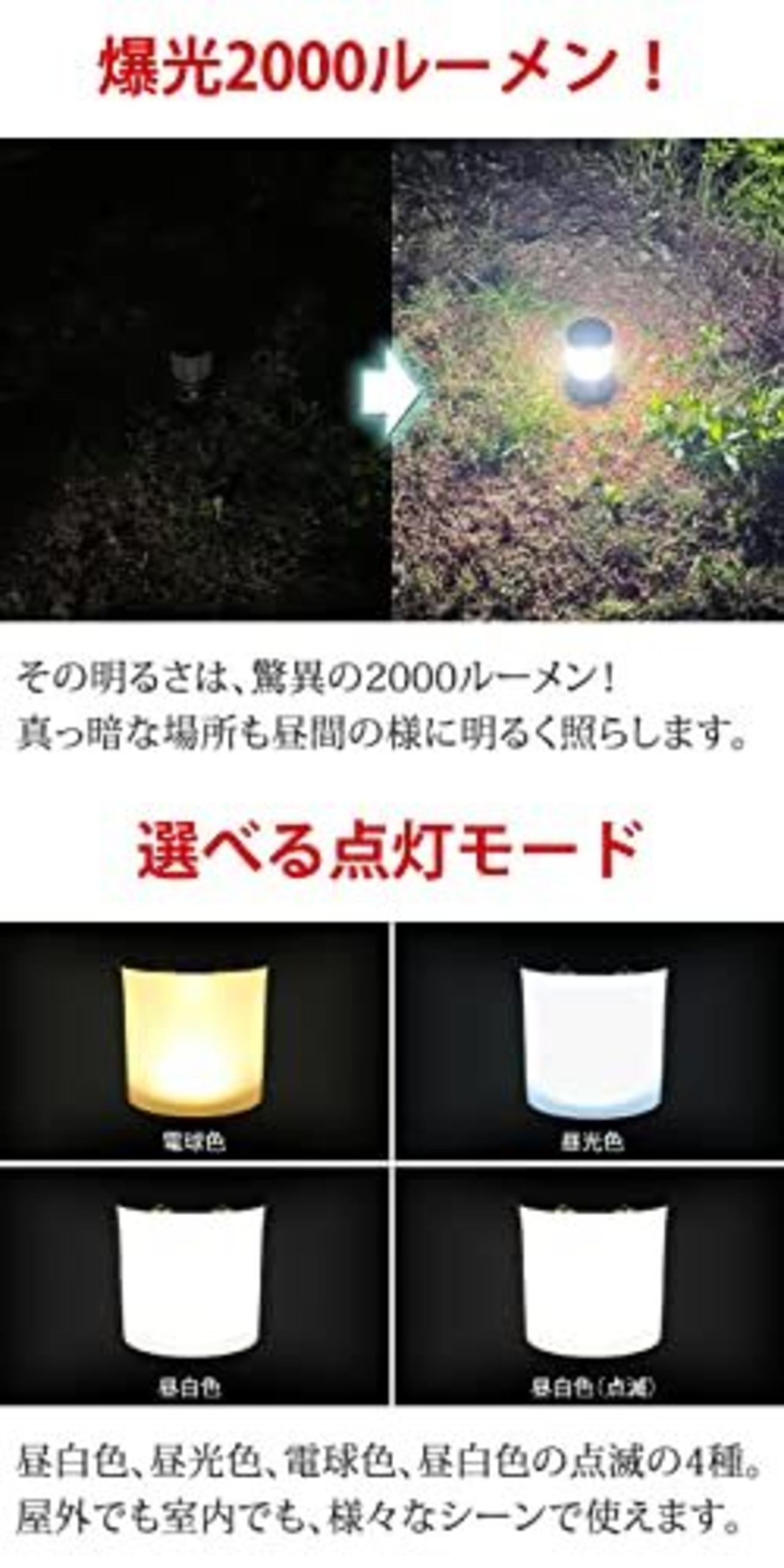 選べる点灯モード:昼白色、昼光色、電球色、昼白色の点滅の4種。 屋外でも室内でも、様々なシーンで使えます。