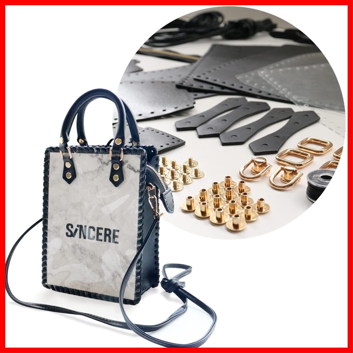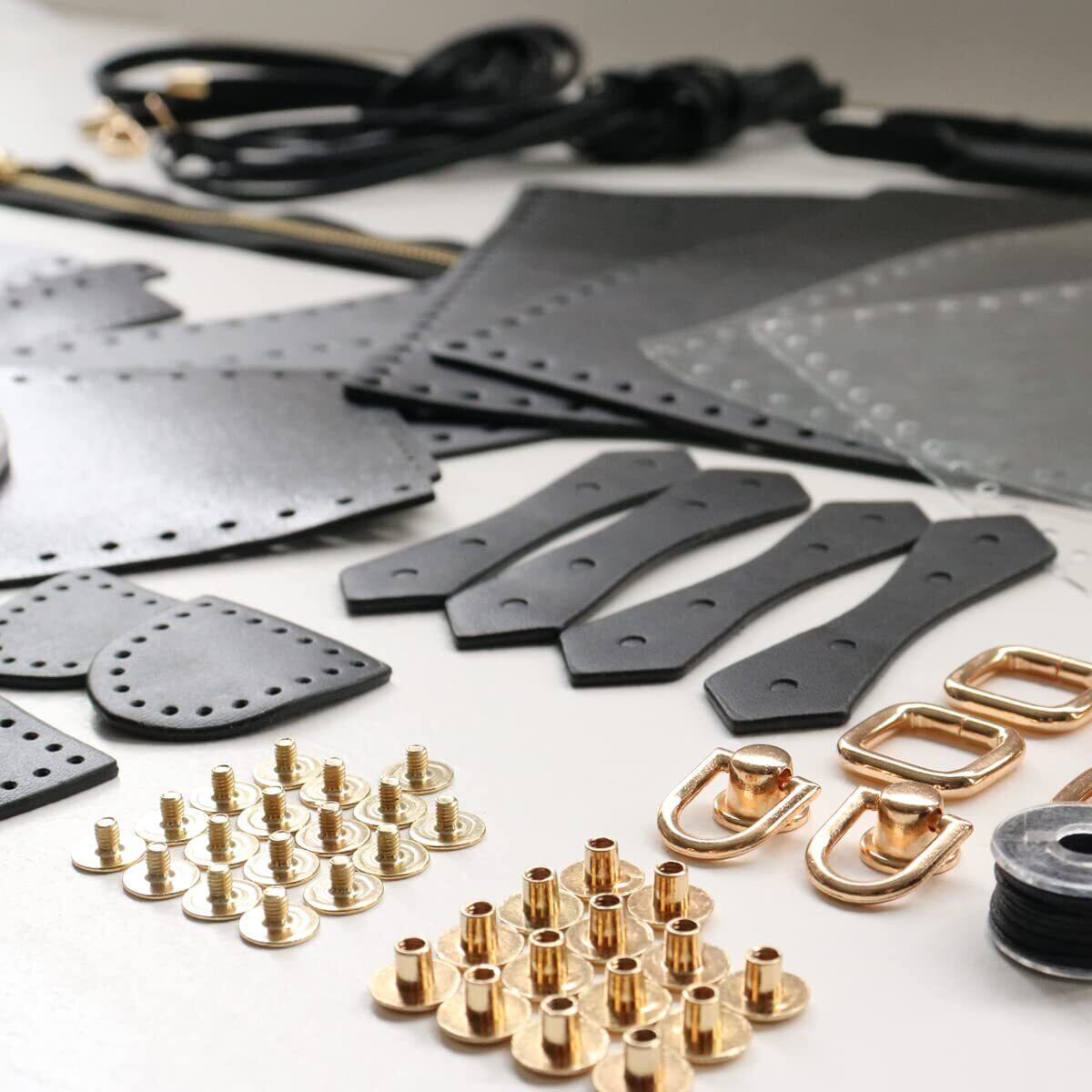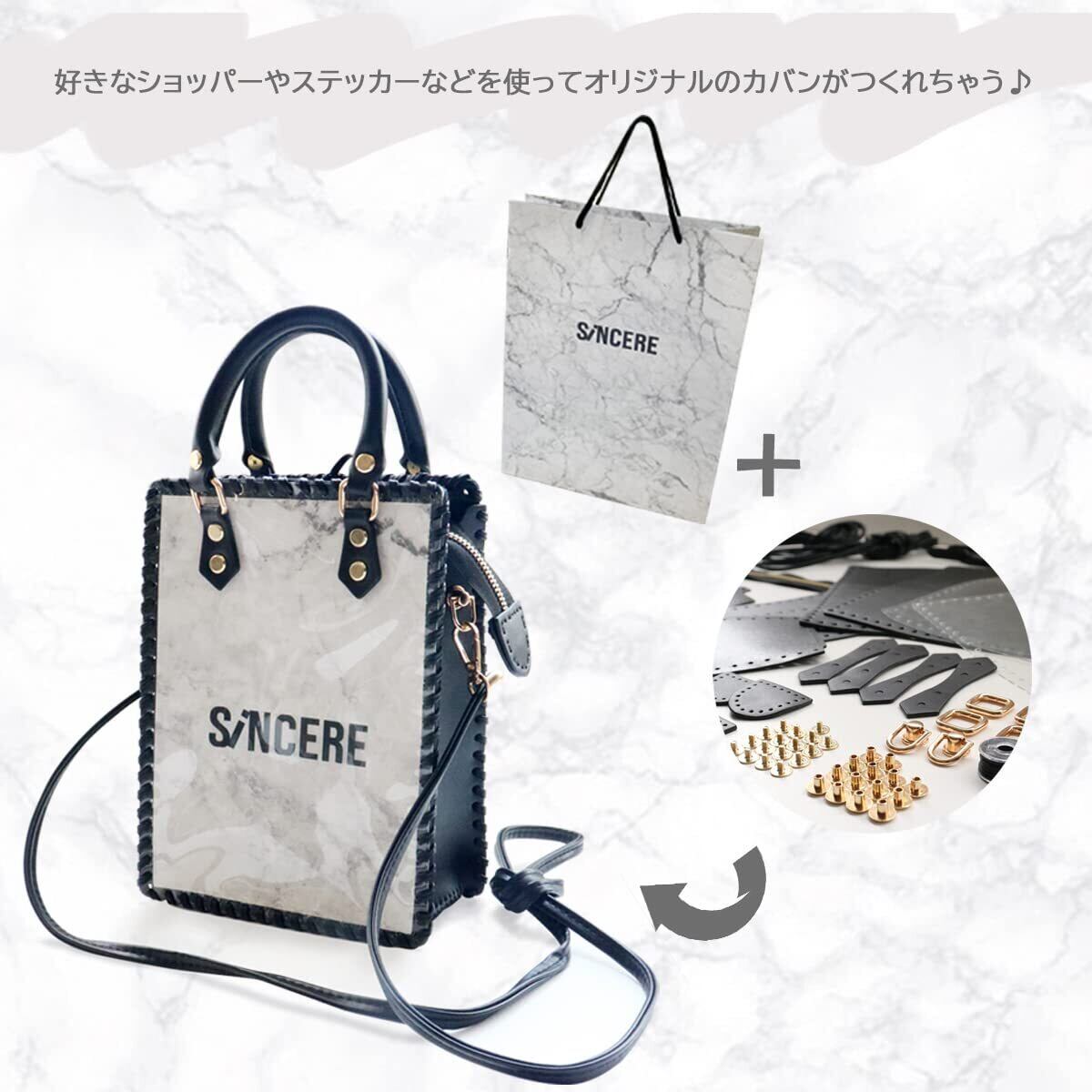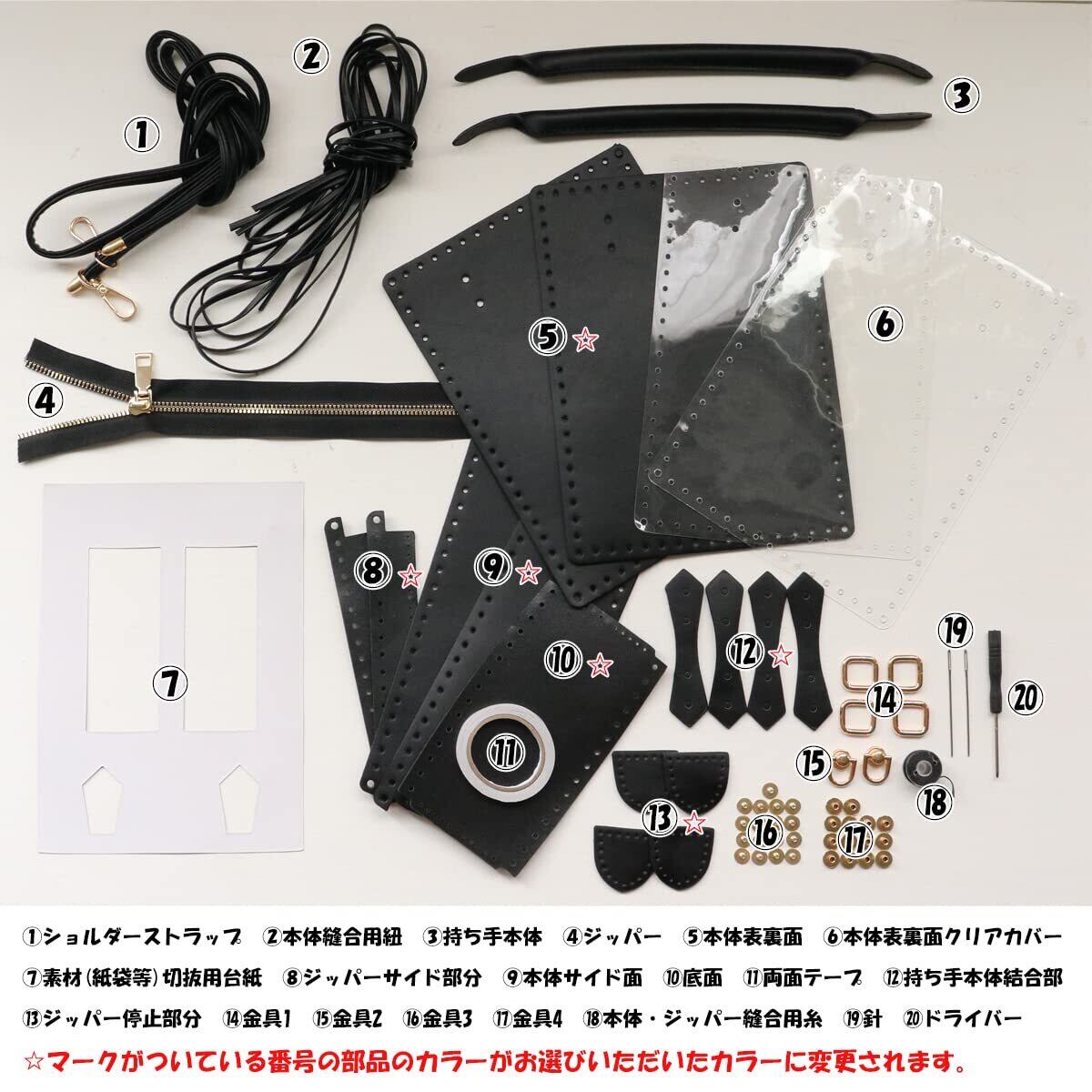 【付属品】カット済みレザー生地、クリアシート、ショッパーカット用台紙、ジッパー、ショルダー、持ち手、金具、紐、針、糸、両面テープ