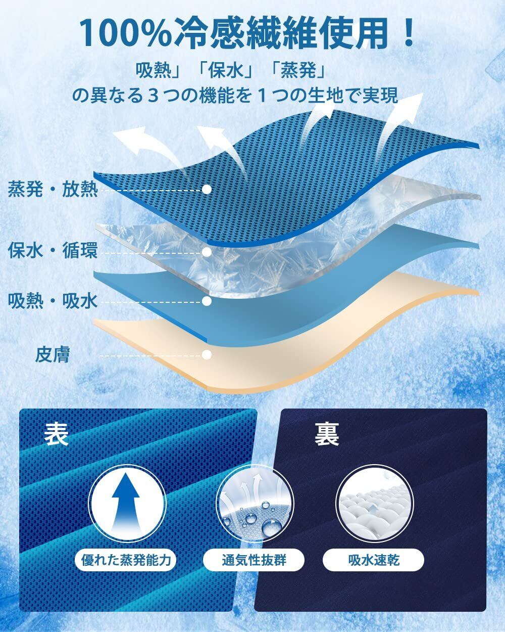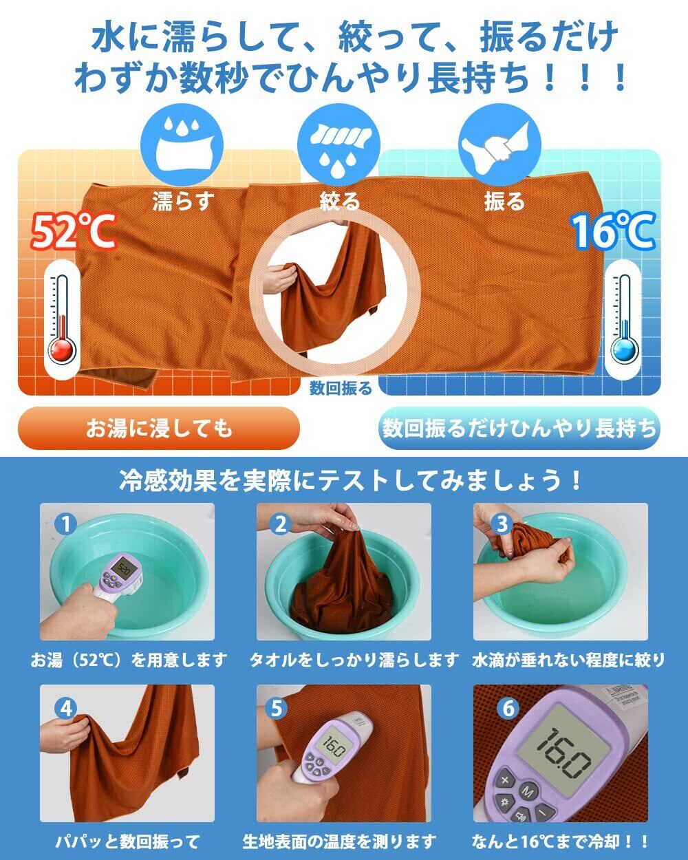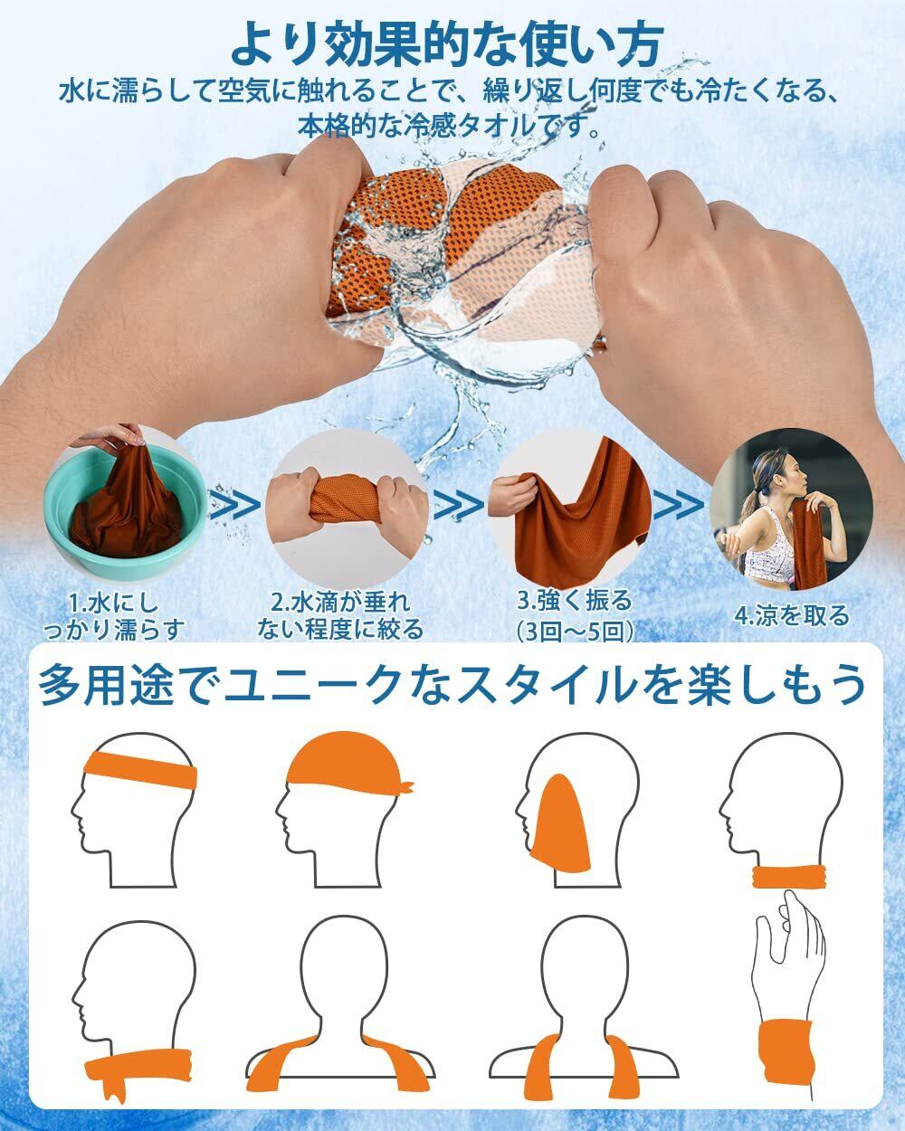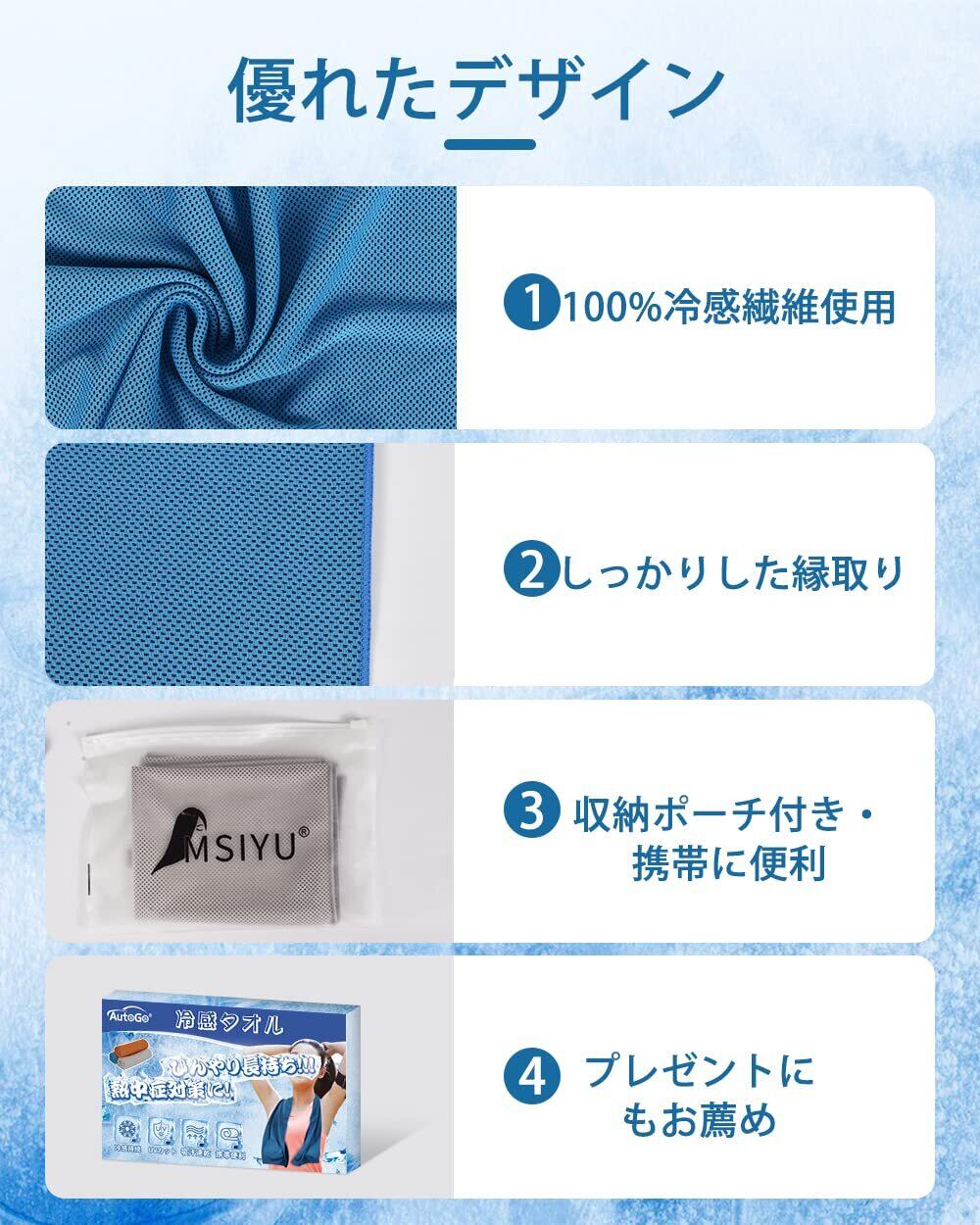 【優れた吸水性と速乾性❄冷感タオル】AutoGo 冷感タオルは100%冷感繊維の生地を使われて、「吸熱」「保水」「蒸発」の異なる3つの機能を1つの生地で実現。吸水性が非常に高いためスポーツ用汗拭きタオルとしても使えます。たっぷり汗をかいても安心です。水分の蒸発速度も市販の冷感タオルより遥かに優れています。化学物質無添加で物理的な冷却、より安全・安心、肌にも優しい。抗菌と防臭加工でいつでも清潔に利用できます。洗濯機でジャブジャブ洗えるので、衛生面が気になる方でも安心です。冷感タオルのひんやり感がなくなっても再度濡らして絞って数回振れば冷たさが戻り、繰り返して使えるエコ商品です。