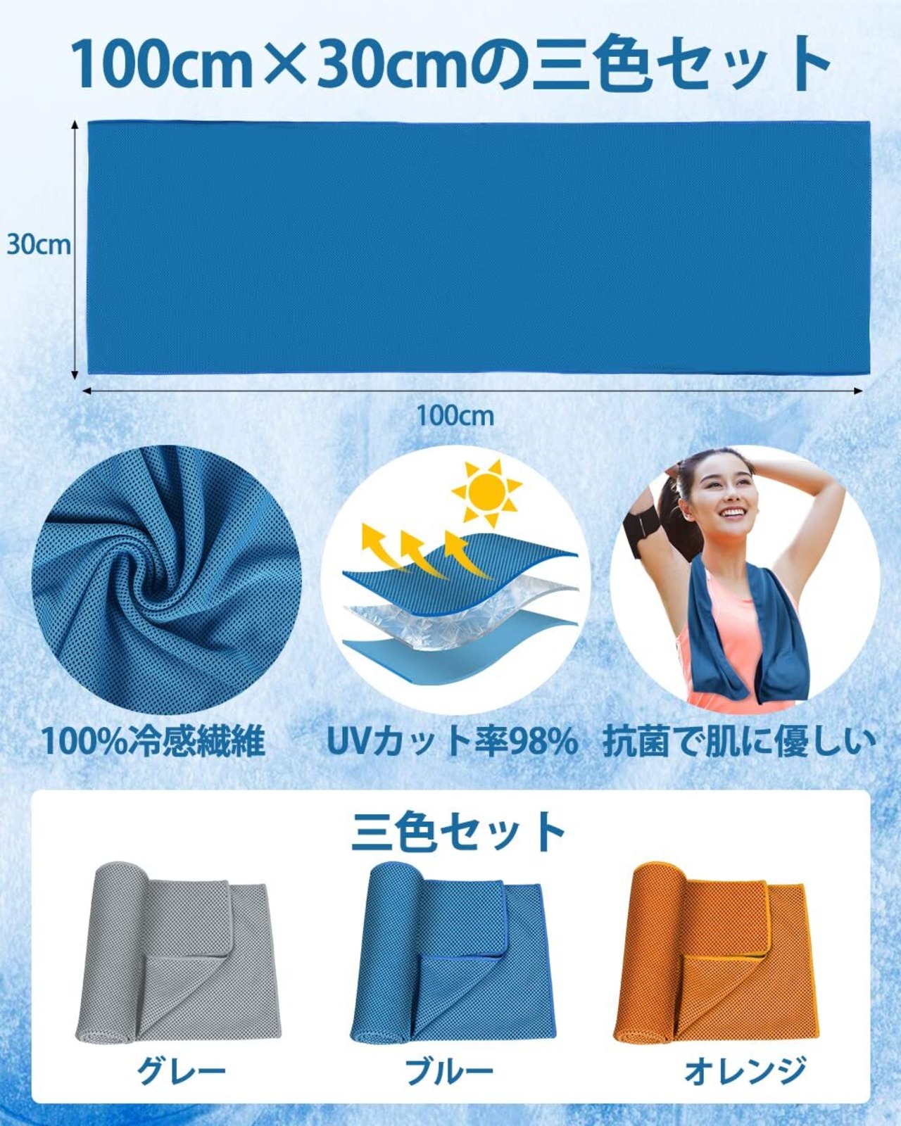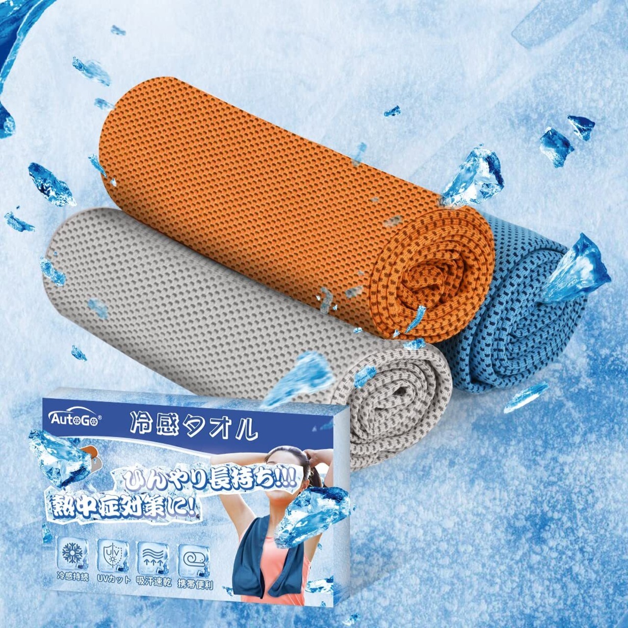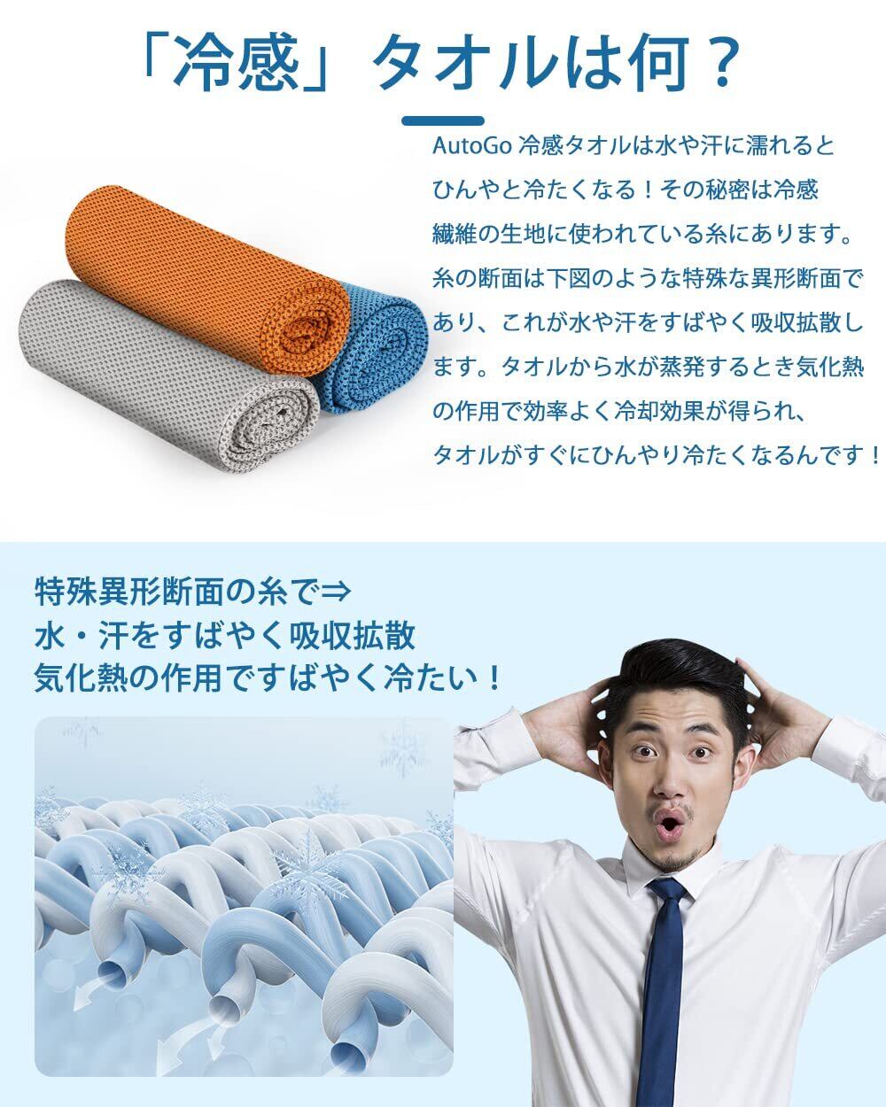 【ひんやり長持ち❄冷感タオル】冷感タオルサイズ:約100CM*30CMの3色セット(カラー:ブルー*1、グレー*1、オレンジ*1 素材:100%冷感繊維)。暑い季節がやってきました。そんな暑い日で心配なのがやっぱり「熱中症対策」!そこでひんやりと冷たく気持ちがいい、暑い季節のクールダウンに!AutoGo 冷感タオル「クールタオル」が登場!冷感タオルを水に濡らして数回振るだけでひんやりします。「クールタオル」の秘密は100%冷感繊維の生地に使われている糸にあります。糸の断面は特殊な異形断面で、水や汗をすばやく吸収拡散します。冷感タオルから水が蒸発するときに、周りから熱を奪うという気化熱の作用で効率よく冷却効果が得られ、冷感タオルがすぐにひんやりと冷たくなるんです!また、冷感タオルをスポーツ等で使用する際は、汗をたくさん吸い取ることで、冷却力が持続するのが魅力です。