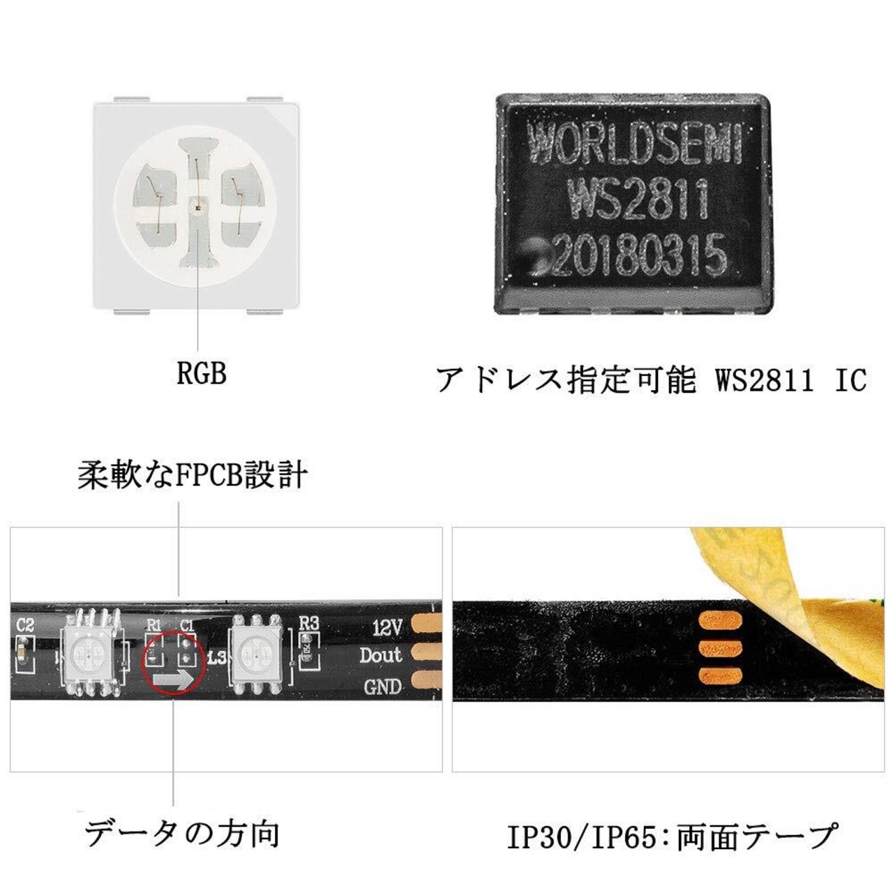 「アドレス可能」ドリームフルカラーLEDテープので、60Leds/mの300個ピクセルはすべて自分の色と高輝度があります。そして、1つのWS2811 ICが3つのLEDを制御します。256高輝度表示と24-bitカラー表示。お客様は自分で好きな色とアニメーションを設定することができます。
