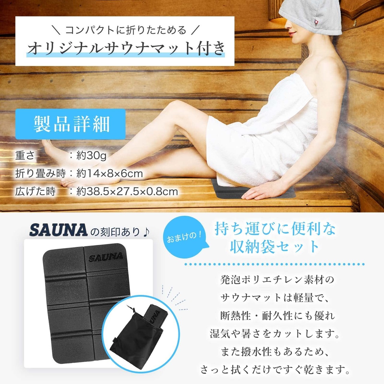 【サウナマットサイズ】広げた時:37.5cm×27.5cm×0.8cm 折り畳み時:14cm×9.5cm×6cm 重さ:約30g 収納袋付き