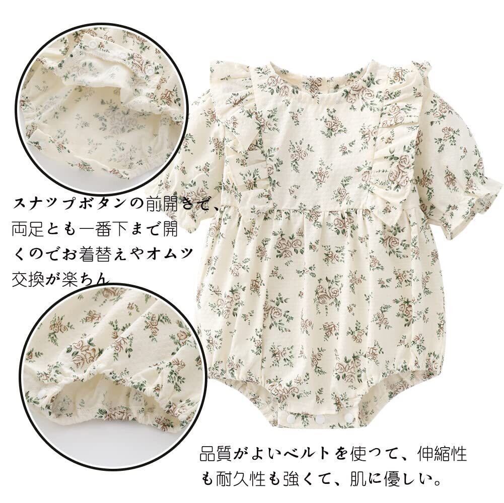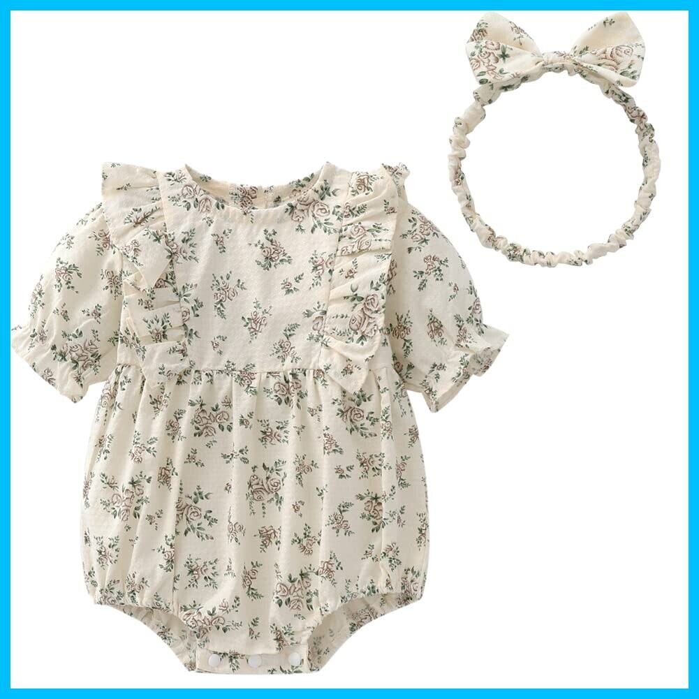 ベビー服 女の子 ボディスーツ 夏 ロンパース 半袖 赤ちゃん服 綿100% 新生児服 ヘアバンド かわいい 花柄 カーキ 80 9-12ヶ月