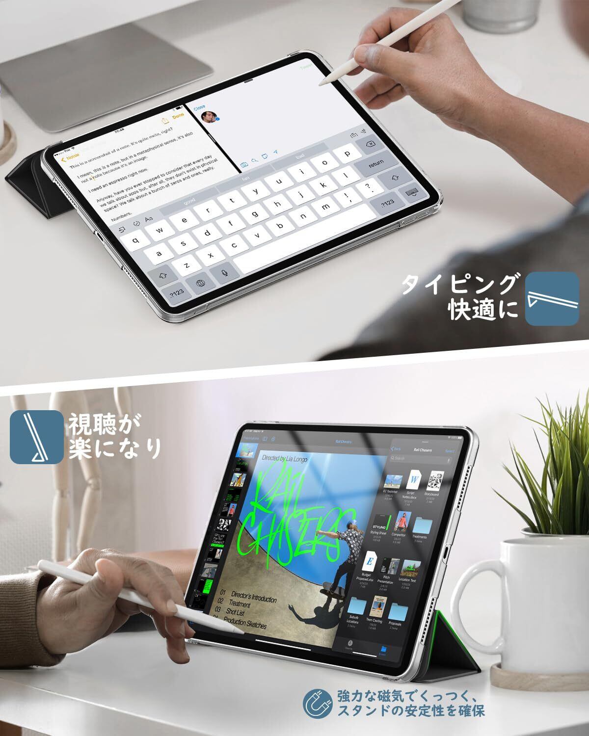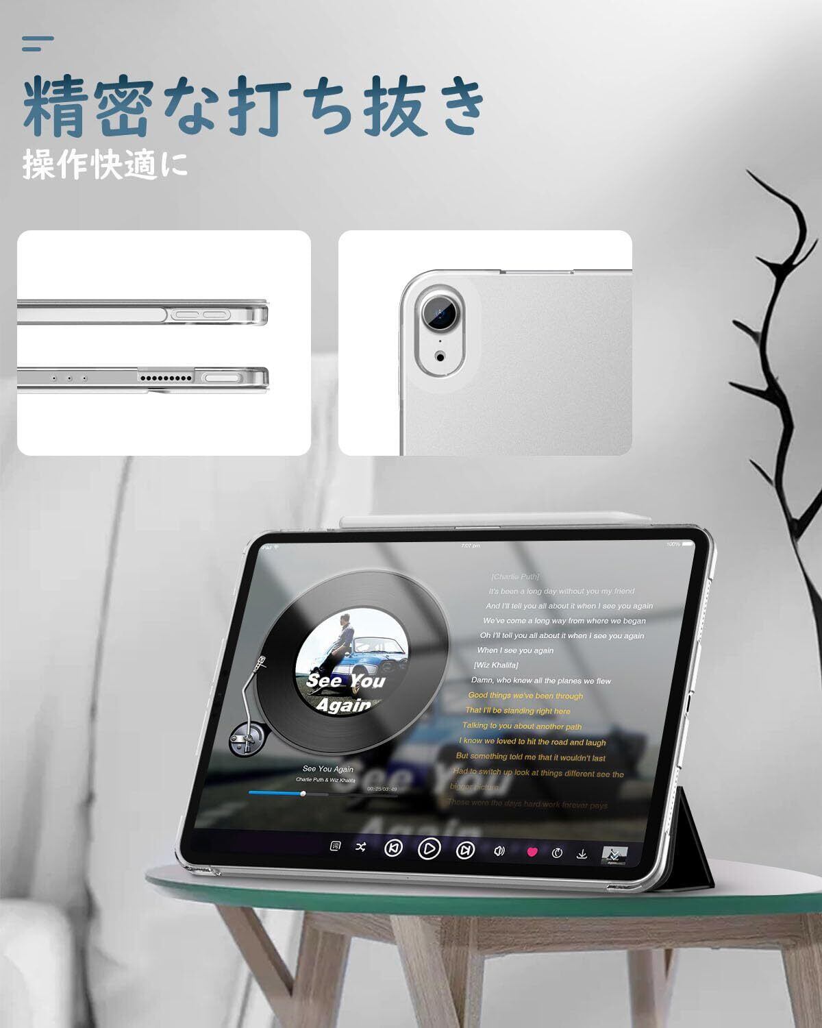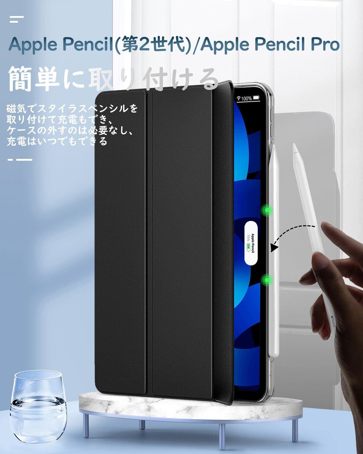 「着装簡単」 簡単に着装できて、ケースを装着したまま電源ボタン、音量ボタン、写真を撮る、充電等すべての機能にアクセスできます。ApplePencil USB-C(iPad Air 11インチ用)の磁気吸着、Pencil Pro(iPad Air 11インチ用)及び ApplePencil第2世代(iPad Air 第5世代/第4世代 10.9インチ用)のワイヤレス充電に対応できます。