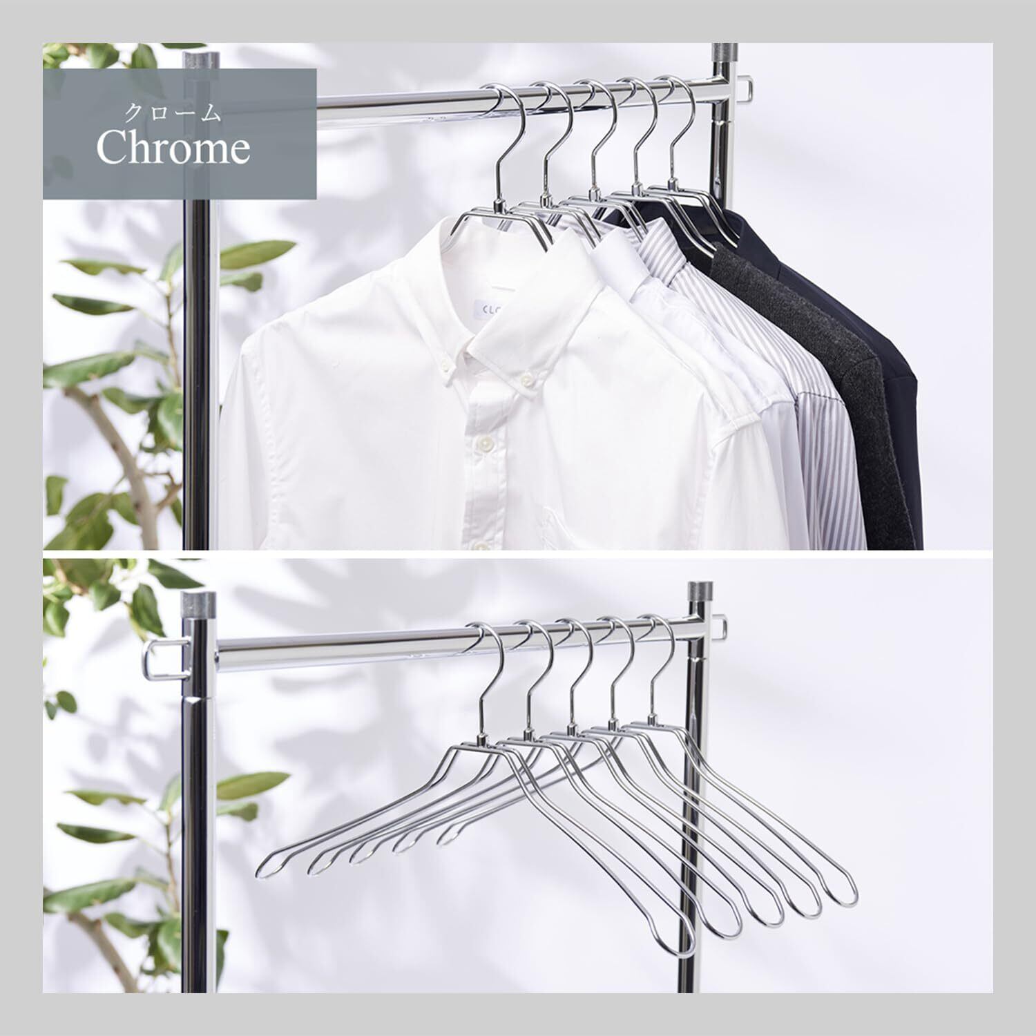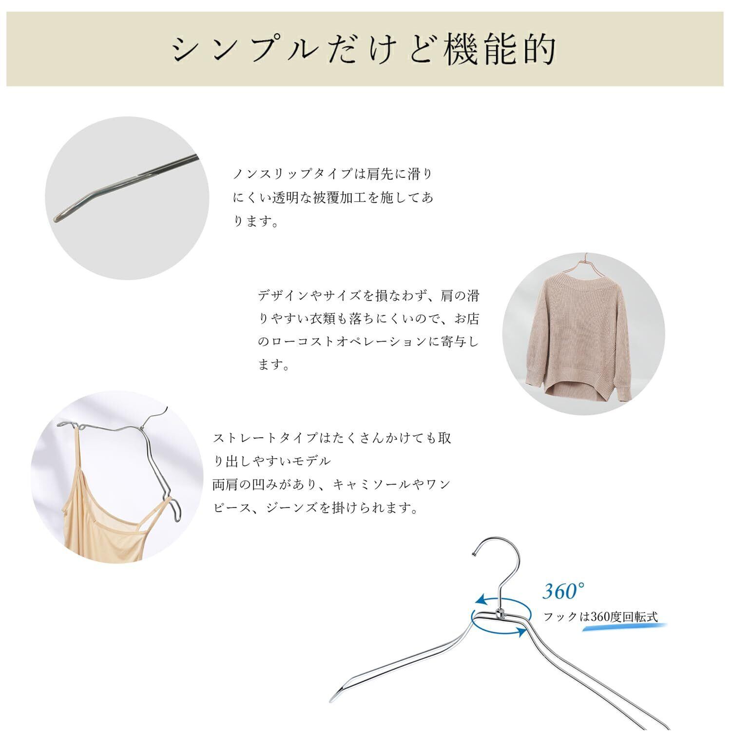 フックは便利な360度回転。 ダブルのワイヤーは肩口の厚みでジャケットなどの型崩れを防ぎます。