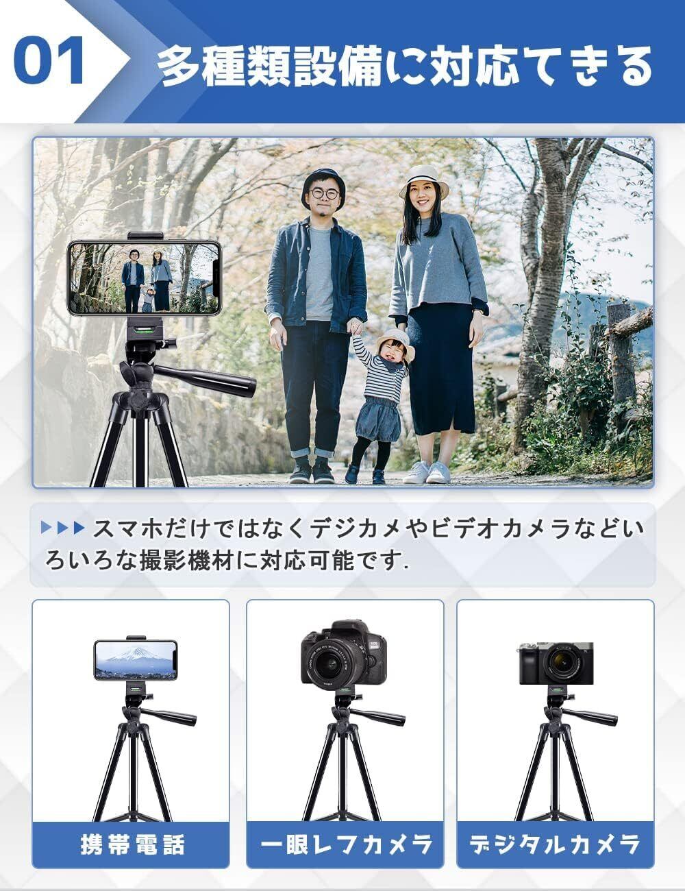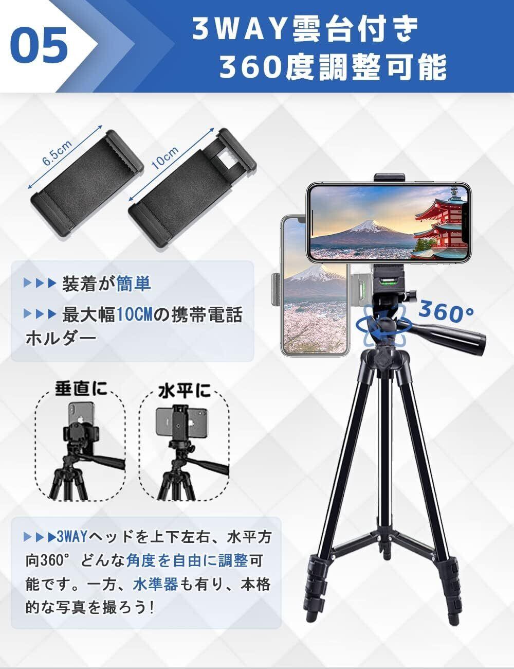 スマホ 三脚 iphone用 Bluetoothリモコン付き 3WAY雲台 4段階伸縮 最大長さ130cm 360°回転可能 スマートフォン 軽量 ミニ三脚 収納袋付き 持ち運び便利 iPhone用/Android/カメラ 一脚 など対応 自撮りや集合写真、生ライブ配信などに適用 日本語取扱書付き