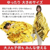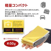 また、リバーシブルで用途が異なり、金色は熱を吸収し、銀色は熱を反射する性質が有ります。 炎天下では銀色側を外側に向けると防暑断熱してくれます。 寒いときは金色を外側に体を包むだけで、体温の放熱を防いでくれます。 緊急時での寒さ対策以外に、登山やスポーツ観戦にも常備しておくと便利です。