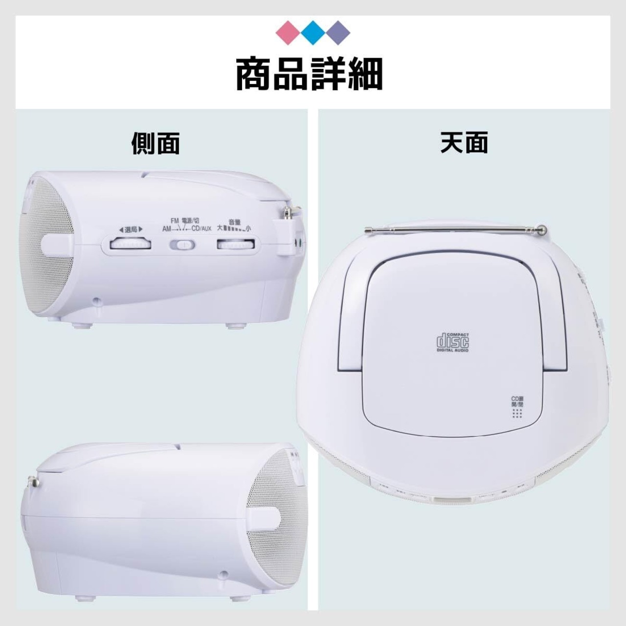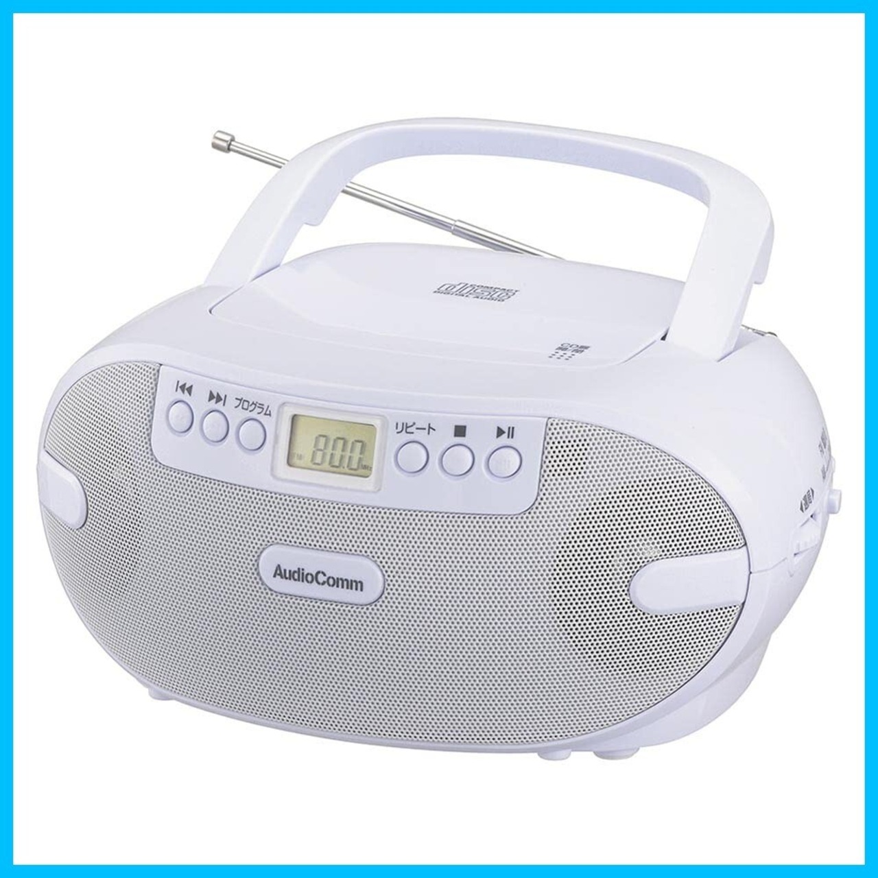 ◆ワイドFM(FM補完放送)対応 ◆CDプログラム(最大20曲まで)・リピート・ランダム再生機能付き ◆CD/選局液晶表示 ◆ヘッドホン出力端子、外部音声入力端子付き ◆キャリーハンドル付き ◆FMロッドアンテナ付き ◆本体カラーはホワイト