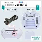 【 特 長 】 ◆AM/FM(ステレオ受信)ラジオ付きCDプレーヤー ◆手軽に持ち運べるコンパクトタイプ ◆外部機器のスピーカーとしても使用可能 ◆コンセント、電池の2電源対応(専用電源コード付属、電池別売) ◆口径66mmスピーカー2基搭載、最大出力1W+1Wのステレオサウンド
