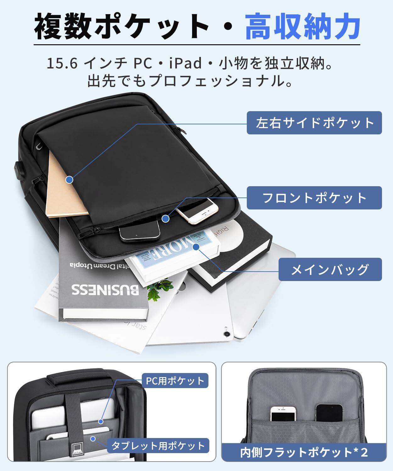 ビジネスリュック メンズ軽量 15.6インチ PCリュック USB充電ポート 多機能 防汚性 通気性 通学 通勤バッグ 出張 防災 旅行 ギフト 男女兼用