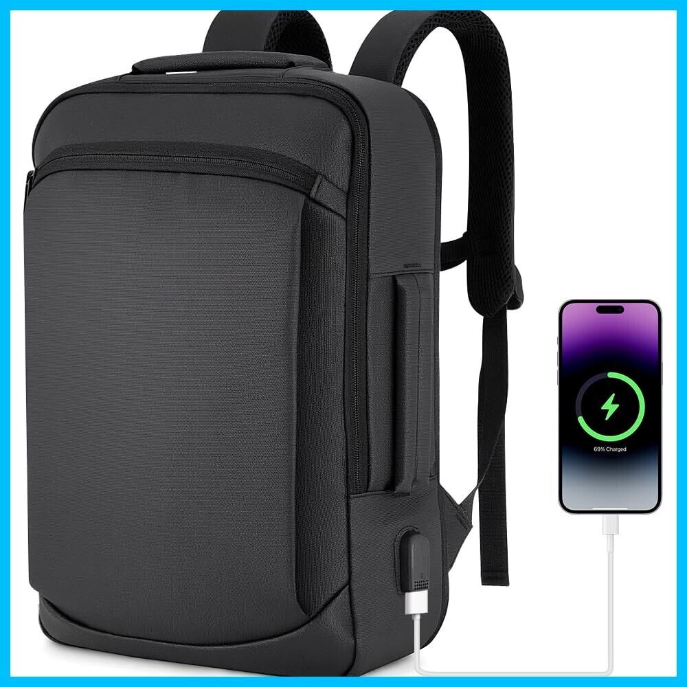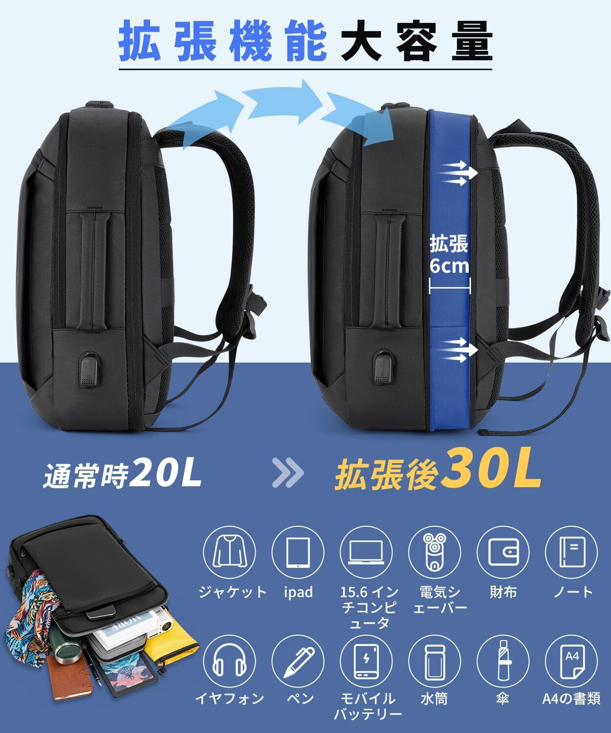 【6cmマチ拡張 & 大容量収納】リュックは6cmマチ拡張設計を採用しています✨。日常通勤時にはコンパクトなサイズで取り回しやすく、2泊3日出張時には拡張して約 30Lの収納スペースを確保できます。独立した15.6インチ PC ポケットには防震緩衝材が搭載されており、ノートパソコンや11インチ iPad を安全に保護できます。内外計7個の分倉ポケットがあるため、充電器・財布などの小物を整理しやすく、通勤や出張のニーズに応えることができます。