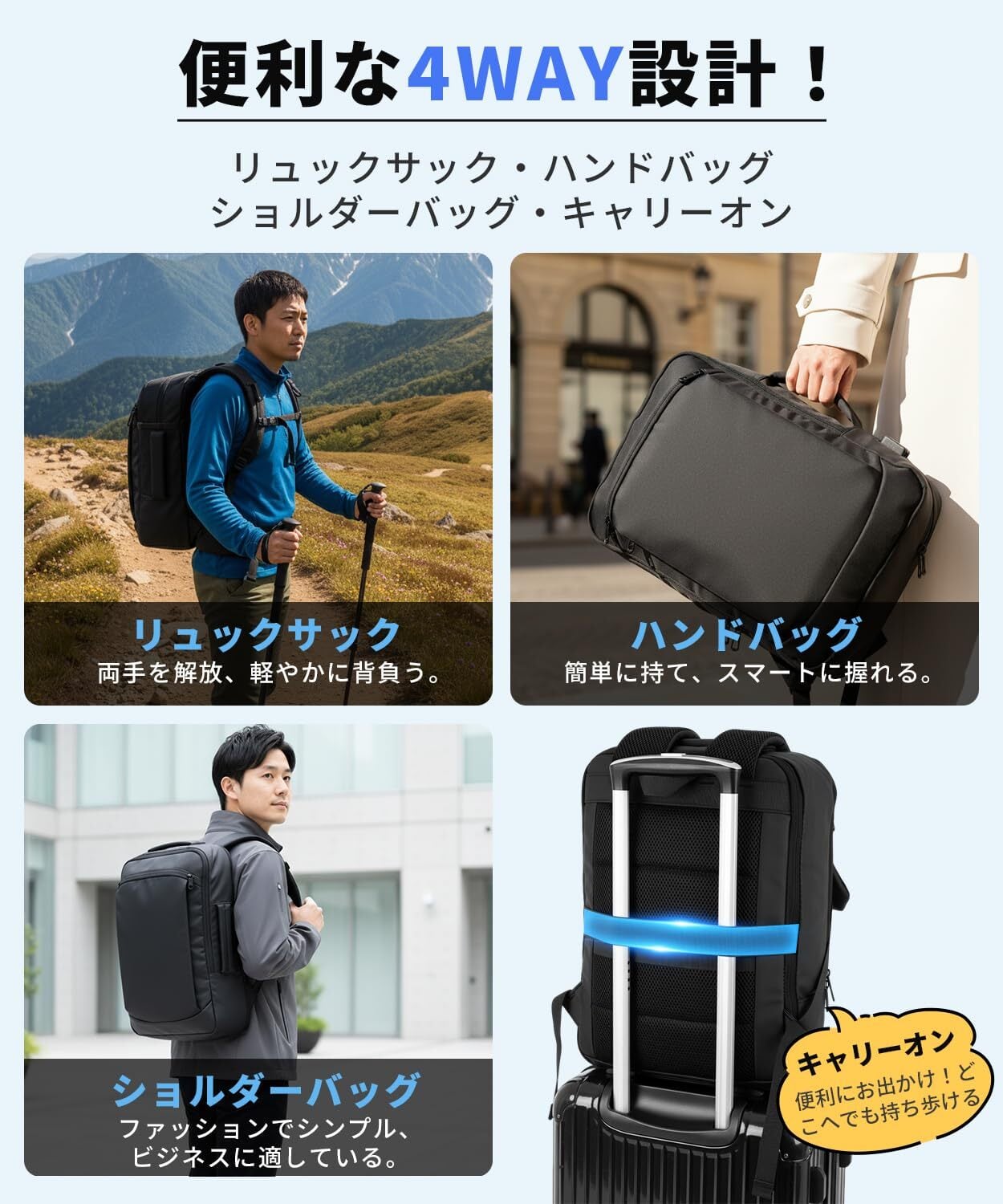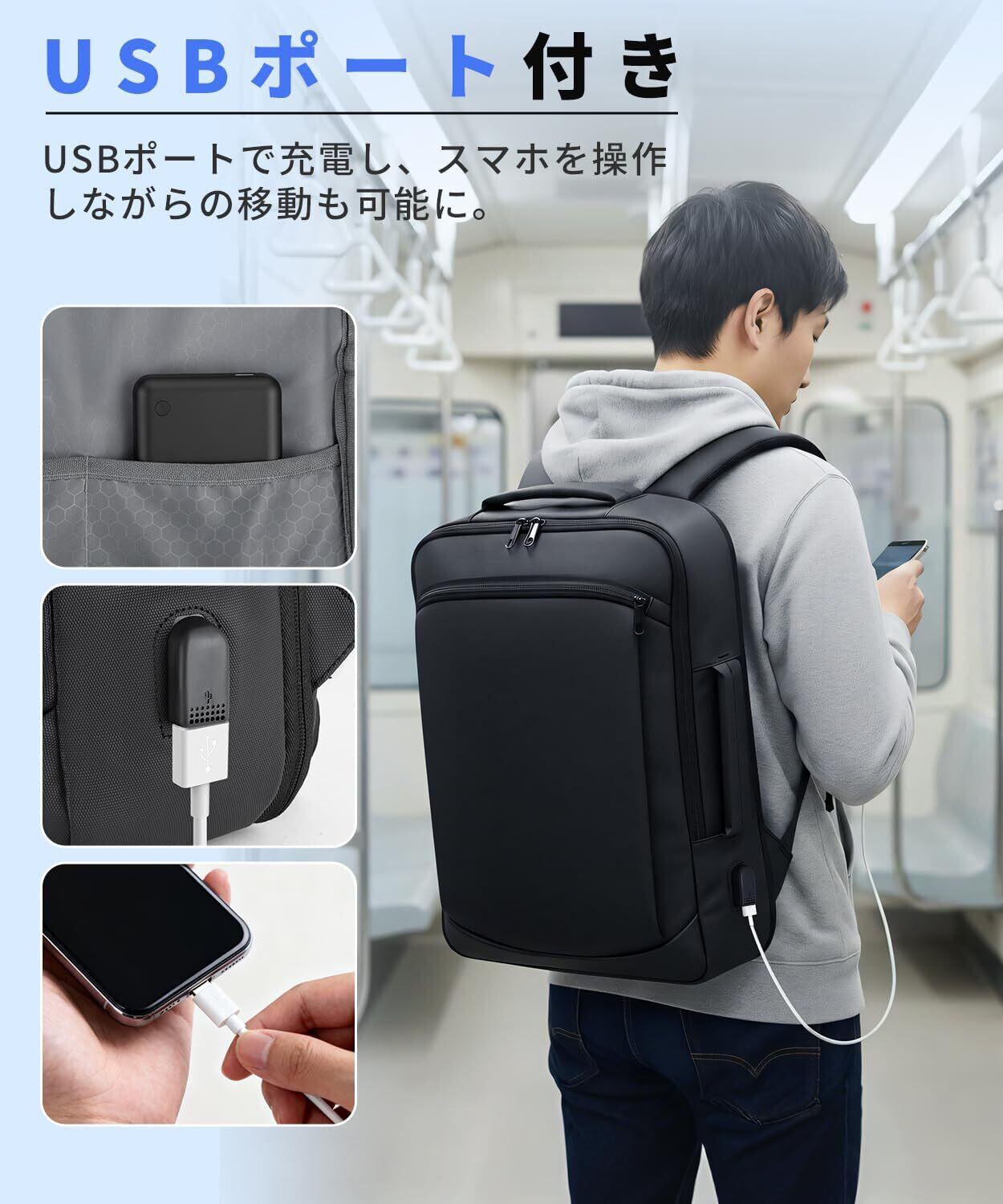 【USB 充電機能 & 便利な4WAY 】ビジネスリュックは外部 USB ポートを搭載しています。バッグ内にモバイルバッテリーを入れれば、電車通勤中や出張移動時に背負いながらスマホを充電することができ、バッテリー切れの不安を解消できます。4WAY 仕様(リュック、横手提げ、縦手提げ、スーツケース連結)に対応しています。また、チェストベルトを付属していますので、リュックのズレを防ぎ、背負い心地を安定させることができます。