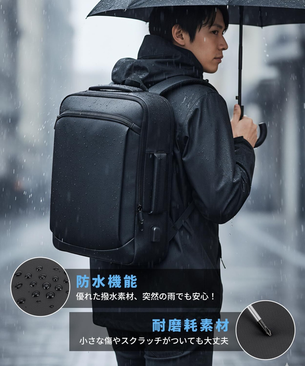 ️【防水生地 & 高耐久性】ビジネスリュックは高密度防水ナイロン生地を使用しています️。にわか雨が降っても、スマホ・PC・重要書類への水滴の沁み込みを防ぐことができます。耐摩耗性に優れているため、毎日の電車通勤でバッグが擦れても破れにくく、長期使用に耐えられます。また、スムーズな開閉の金属ファスナーを装備していますので、長期間繰り返し使用しても噛み合い不良が起こりにくく、ビジネスシーンや旅行での耐久性を確保できます。