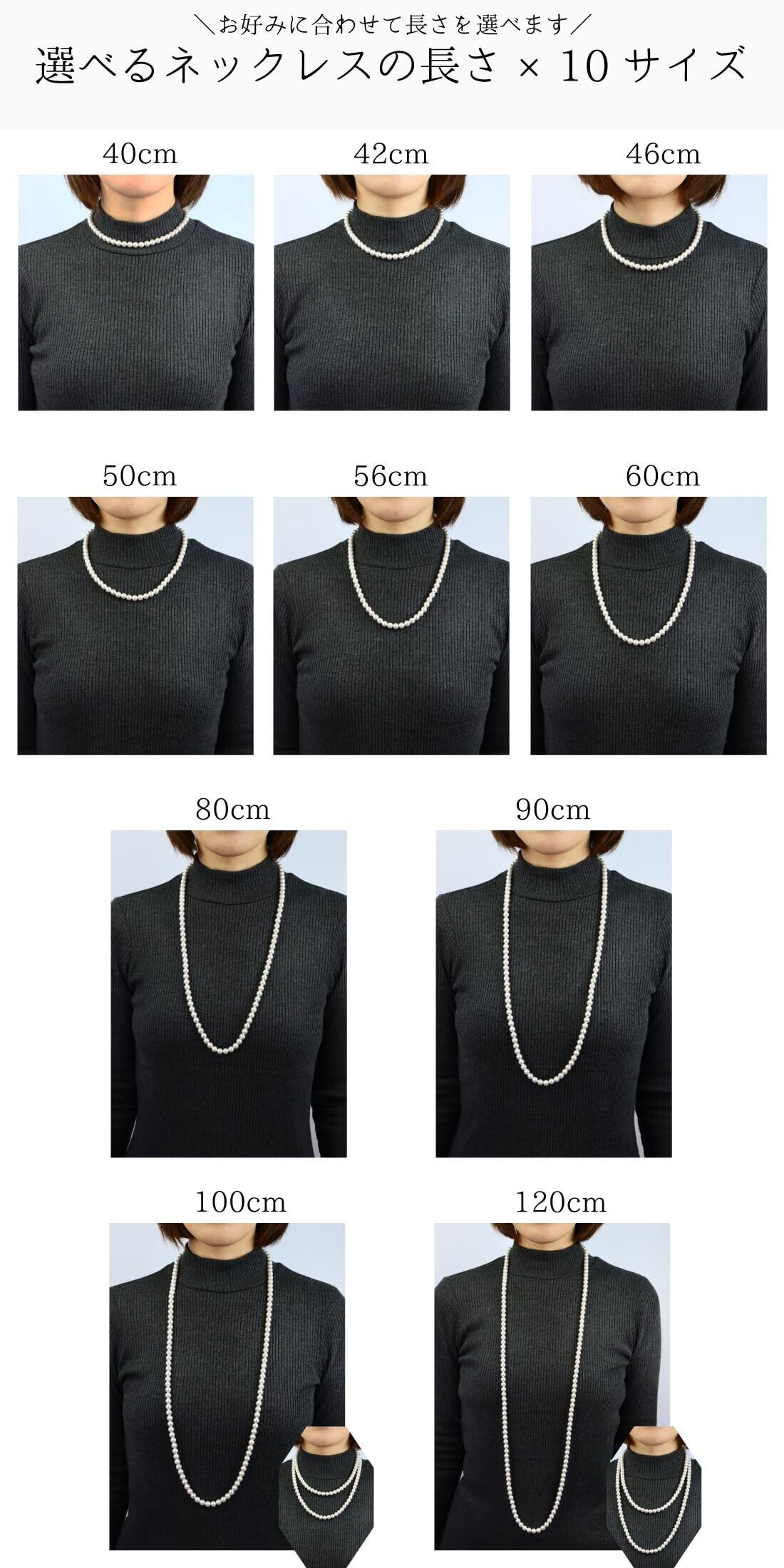 【使いやすいサイズとお買い得セット!】 フォーマル な装いに合わせやすい 8mm パール珠を採用。 ・定番のサイズ:40cm、42cm、46cm ・ゆったりサイズ:50cm、56m、60cm ・ロングサイズ:80cm、90cm、100cm、120cm ※一般的にプリンセスサイズと呼ばれる40cm~46cmの長さのネックレスは、チョーカーの40cmサイズと鎖骨あたりにフィットする42cm46cmサイズになります。冠婚葬祭でつけるパールネックレスは、この長さが一般的です。どんな方にも似合う長さで、自然な印象なので、つける機会の多いネックレスです。はじめてのパールネックレスには、この長さがおすすめです。 ※ゆったりサイズがお好みのお客様へ、50cm~60cmの長さのネックレスをご用意いたしました。冠婚葬祭以外のお出かけでもご使用されたい方や締め付けが苦手な方にはこちらの長さがオススメです。 ※カジュアルで使えるロングタイプは80cm~120cmまで用意しました。100cm、120cmは2連アレンジが可能です!