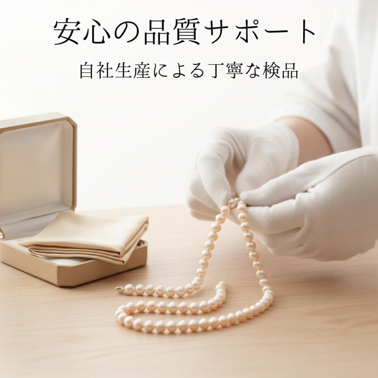 【高品質の日本製!】 素材、金具、組み付けともに国内の職人が手作業で生産しております。国産の留め金具はおしゃれなローズモチーフで高級感を演出。また、耐久性に優れている日本製の糸を使用しています。糸をパール珠に二重にして通しておりますので、更に丈夫に仕上がりました。永くご愛用いただけるアイテムです。