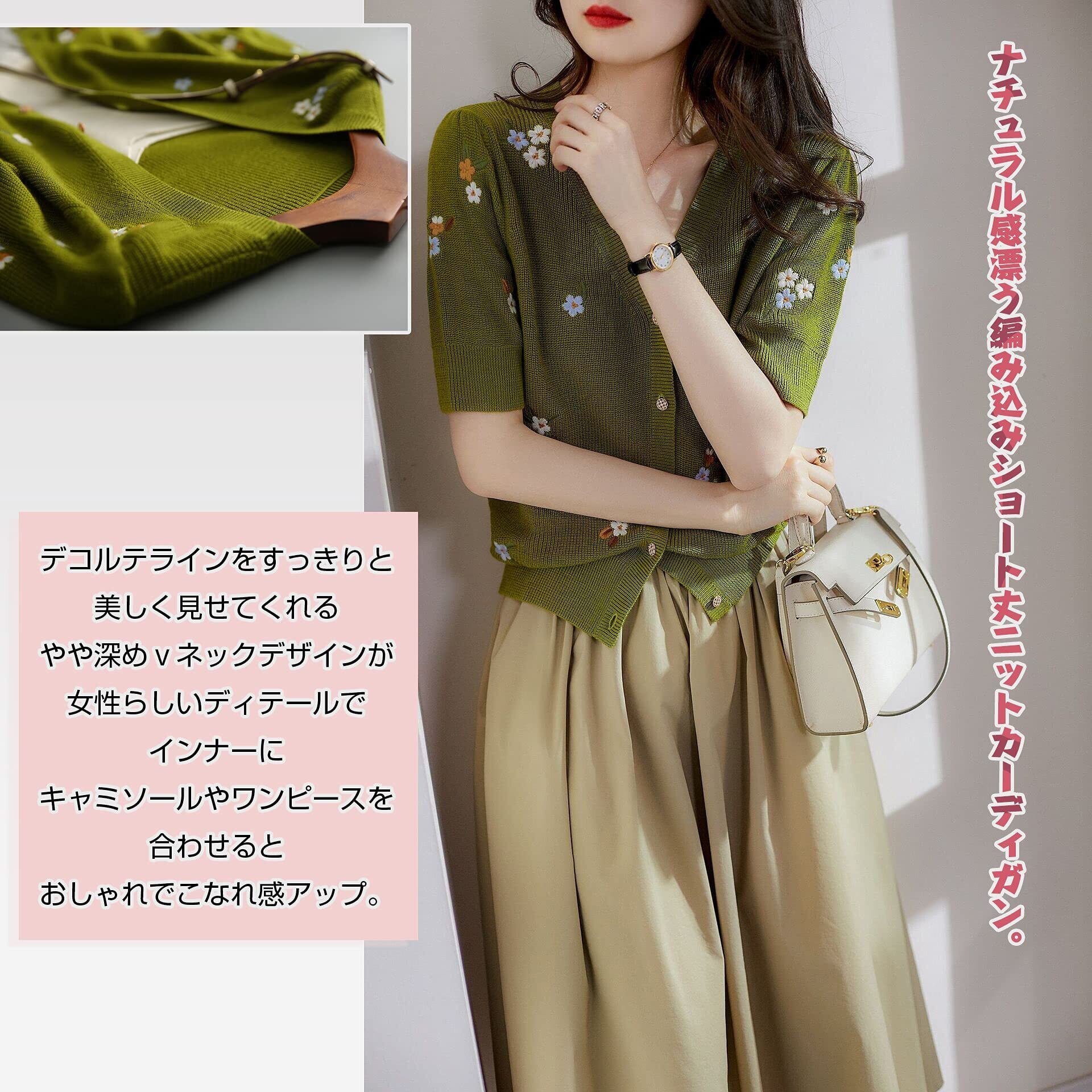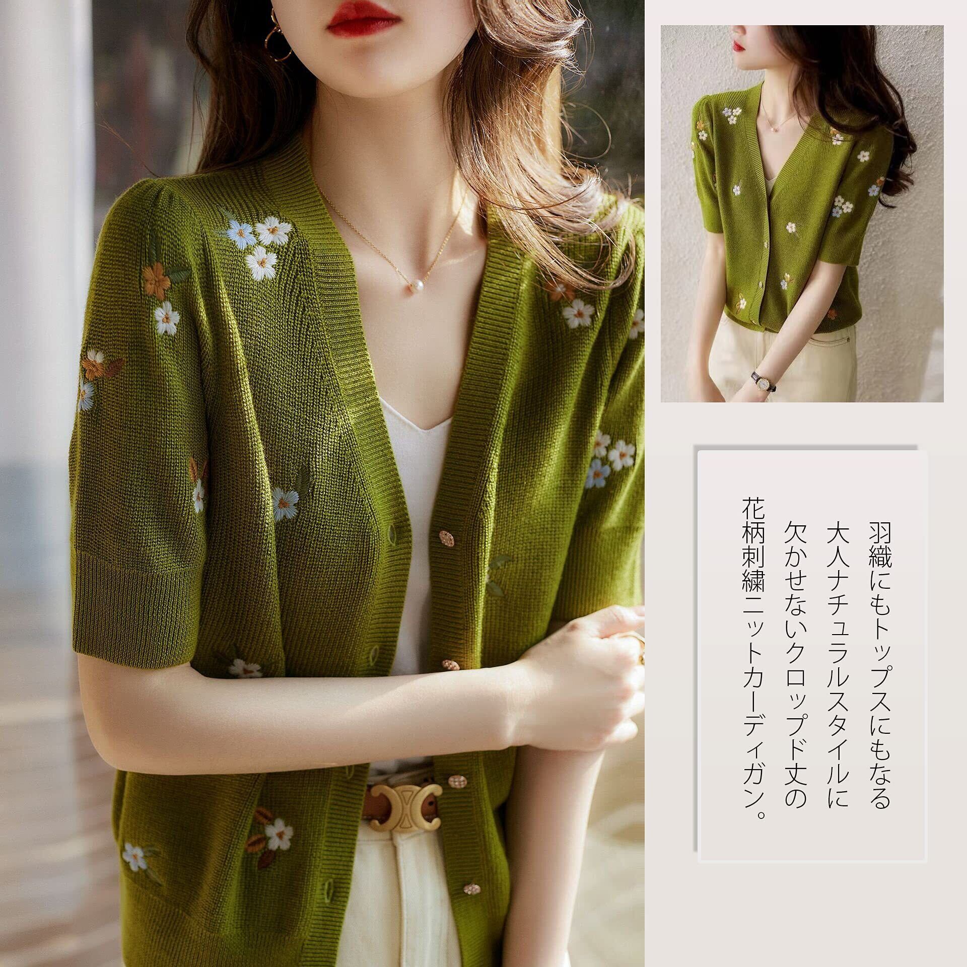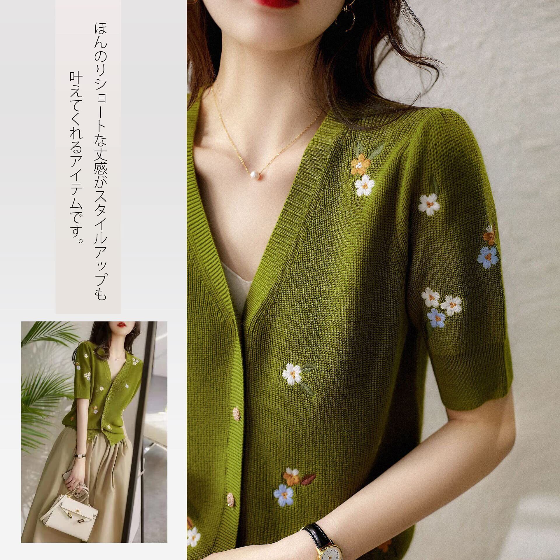 半袖 カーディガン ニット ショート丈 可愛い 花柄 刺繍 サマーニット トップス vネック レディース 夏 グリーン S