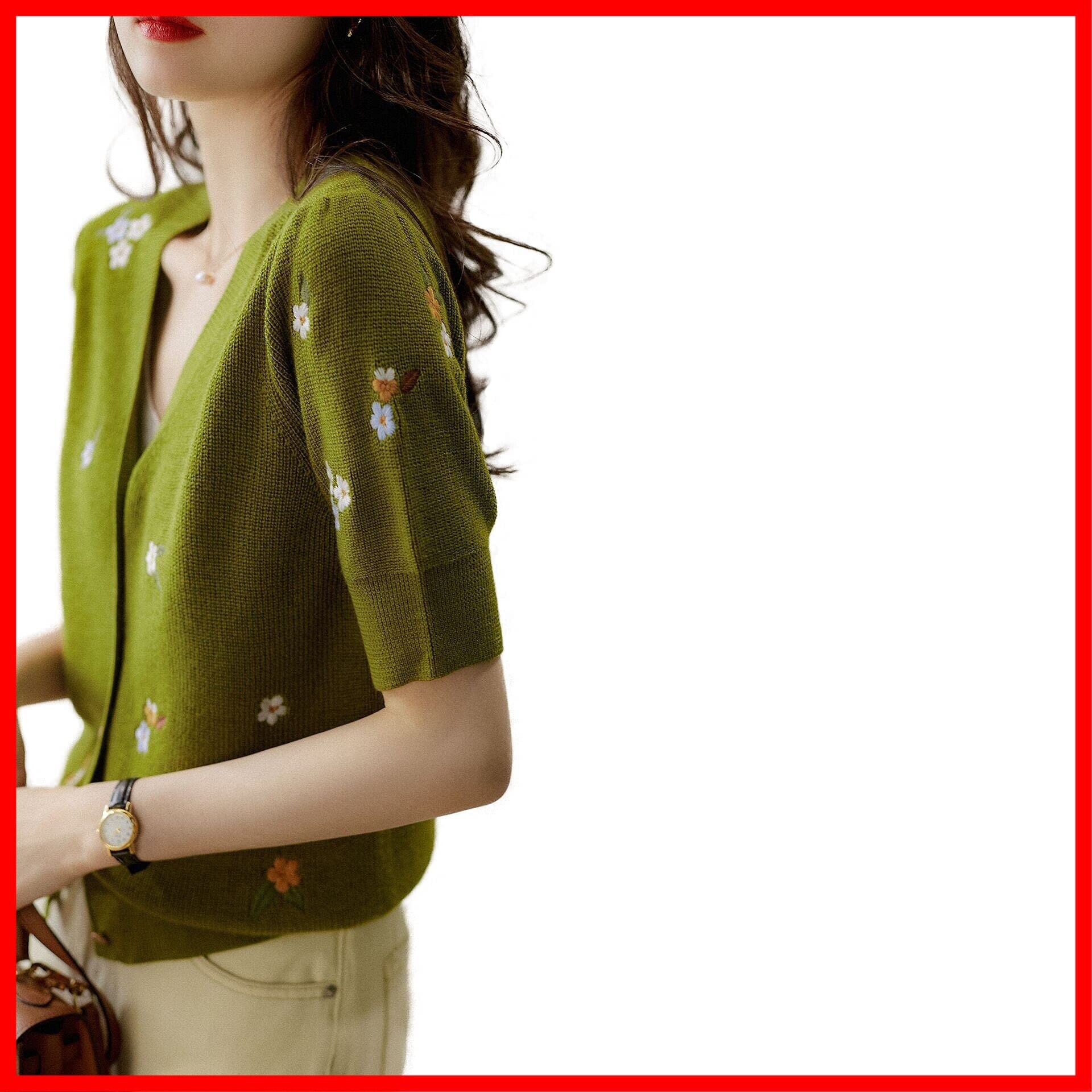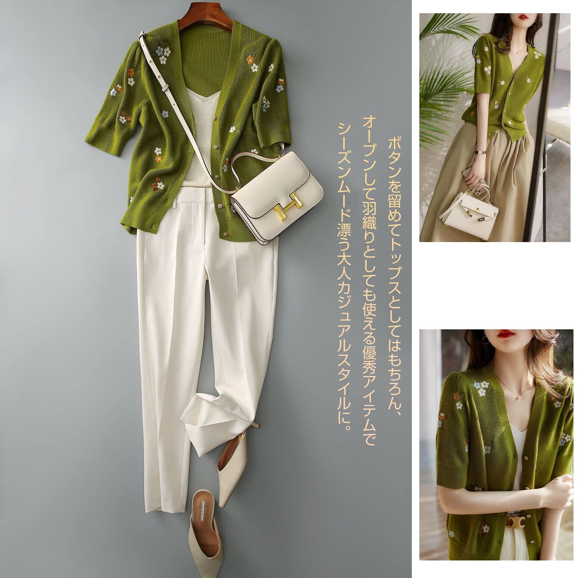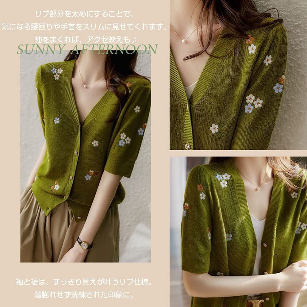 半袖 カーディガン ニット ショート丈 可愛い 花柄 刺繍 サマーニット トップス vネック レディース 夏 グリーン S