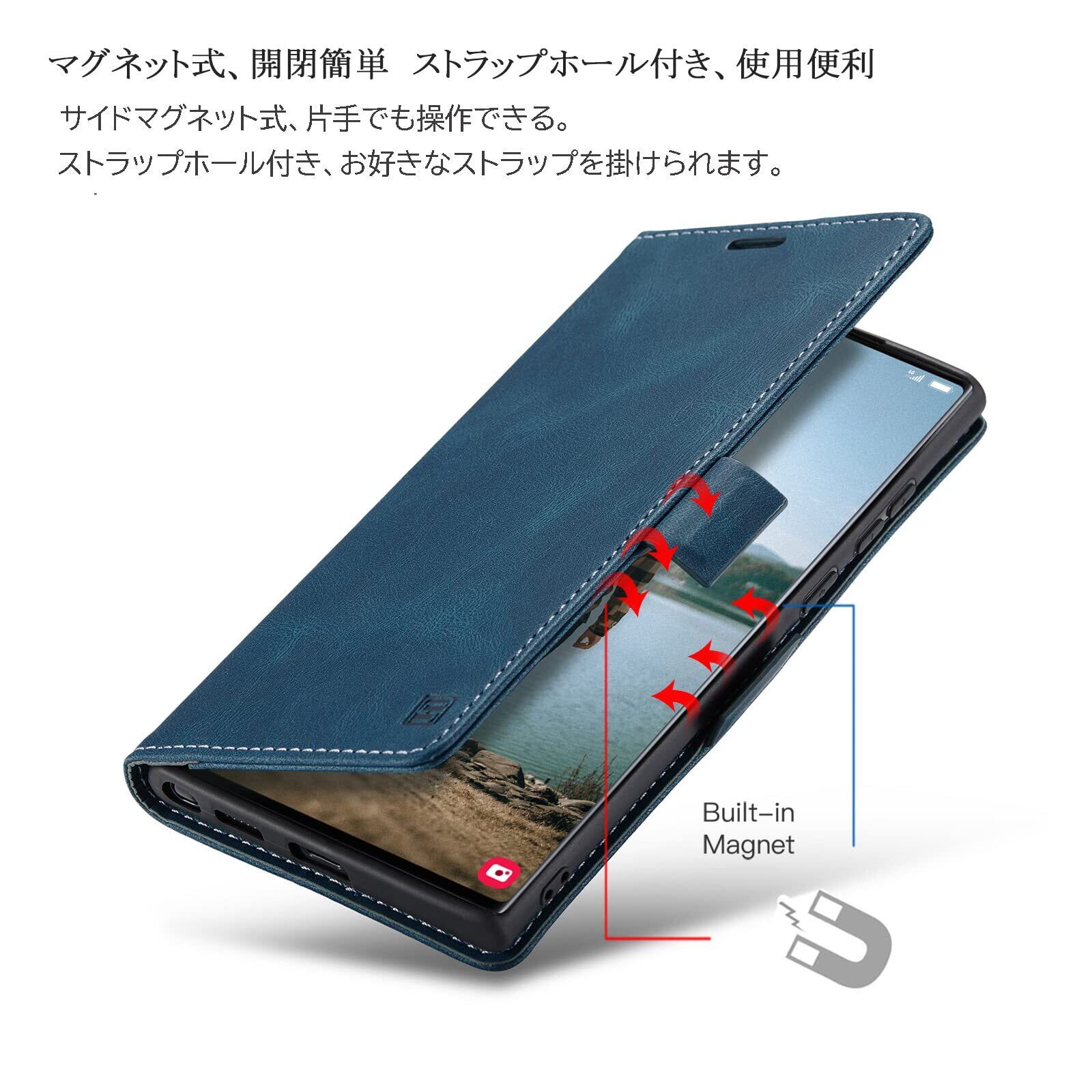 【磁気防止RFID功能 &機能性 4in1】磁気カードを保護するために磁器遮断功能があり、スキミング防止、不正アクセスから大切なクレジットカード、キャッシュカード、IDカードなどの個人情報を守れるRFIDスキミング防止の機能も備えています;①横置きスタンド機能:動画視聴でも手に持つ必要がなく、超楽々動画視聴が可能です;②財布型:ケースの裏側に一つのカードポケットとお札入れのフリーポケット一つあり、ショップでのポイントカード、交通機関でのスムーズな移動をサポートでき、 SUICA / PASMO / ポイントカード / メモ 等収納でき、ちょっととしたお出かけてもこれで十分です;③留め具なし、マグネット内蔵 ベルトなし、片手でも簡単操作できる;④ストラップホールはTPUケースの右下にあり、お好きなストラップを使用し、生活にもっと便利になり、または各種ボタンの使用、カメラ撮影、スピーカーホール等、すべての機能もそのまま立て掛けて稼働します;