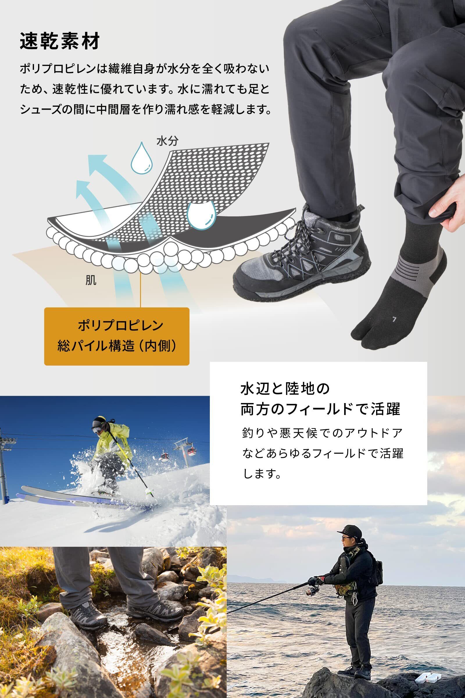【速乾素材】ポリプロピレンは繊維自身が水分を全く吸わないため、速乾性に優れています。水に濡れても足とシューズの間に中間層を作り濡れ感を軽減します。釣りや悪天候でのアウトドアなどあらゆるフィールドで活躍します。