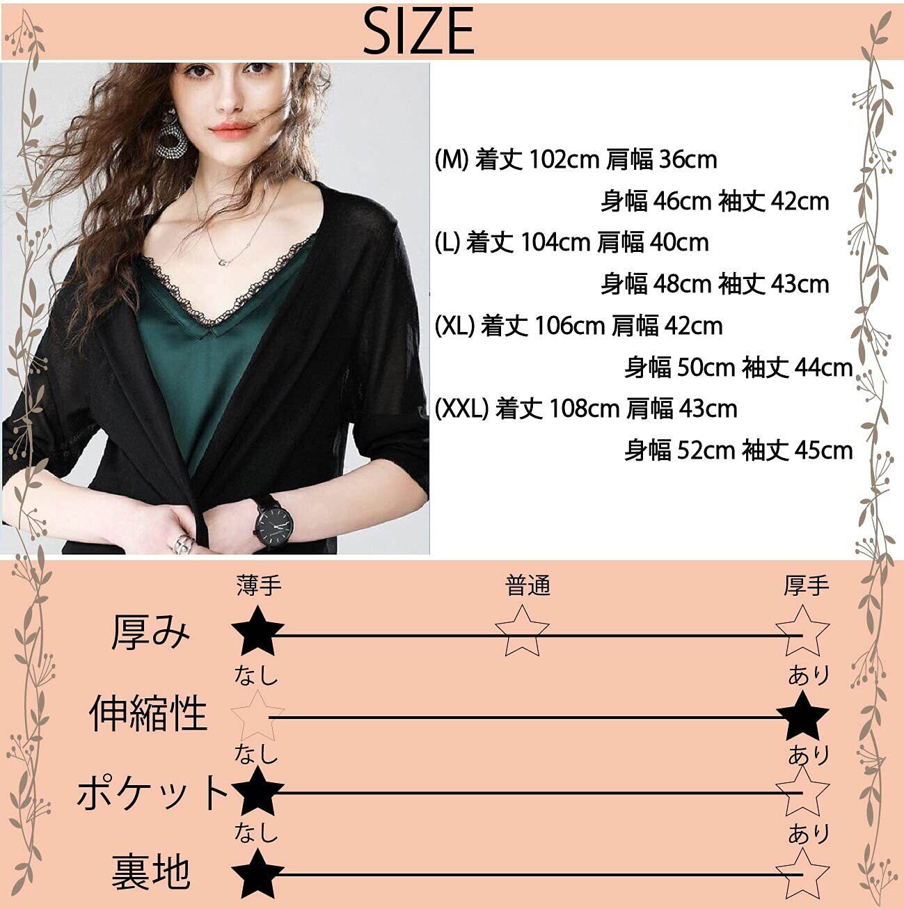 (M) 着丈 102cm 肩幅 36cm 身幅 46cm 袖丈 42cm (L) 着丈 104cm 肩幅 40cm 身幅 48cm 袖丈 43cm (XL) 着丈 106cm 肩幅 42cm 身幅 50cm 袖丈 44cm (XXL) 着丈 108cm 肩幅 43cm 身幅 52cm 袖丈 45cm